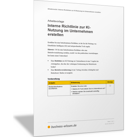 In dieser Vorlage ist erläutert, was Sie im Einzelnen alles klären und vorbereiten sollten, wenn Sie eine interne Richtlinie oder eine Betriebsvereinbarung erstellen, die in Ihrem Unternehmen den Einsatz von Künstlicher Intelligenz (KI) regelt. Stellen Sie mit dieser Vorlage alle benötigten Unterlagen und Informationen zusammen. Damit haben Sie die Grundlage, um eine entsprechende Richtlinie oder Betriebsvereinbarung zu erstellen und zu formulieren.