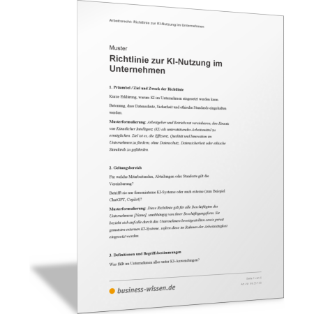 In dieser Vorlage sind alle Punkte benannt, die eine Richtlinie zur KI-Nutzung im Unternehmen enthalten kann oder enthalten sollte. Zu jedem Punkt finden Sie eine kurze Anmerkung sowie eine beispielhafte Musterformulierung. Diese Formulierung können Sie anpassen oder ergänzen. So erstellen Sie Ihre individuelle Richtlinie zur Anwendung der Künstlichen Intelligenz (KI) und damit verbundener Tools und Plattformen für Ihr Unternehmen.