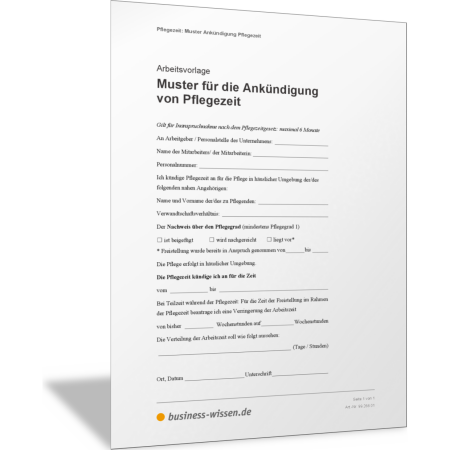 Arbeitnehmer dürfen für die Pflege von nahen Angehörigen gemäß Pflegezeitgesetz bis zu 6 Monate lang Pflegezeit in Anspruch nehmen. Nutzen Sie diese Vorlage mit einer Musterformulierung, um Ihre Pflegezeit dem Unternehmen rechtzeitig mitzuteilen.