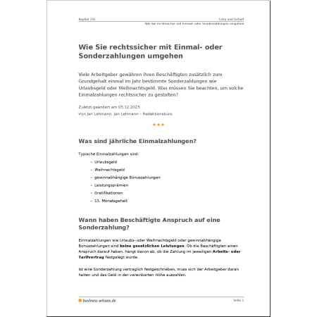 Dazu enthält das Dokumentenpaket Vorlagen zur Dokumentation von Gehaltserhöhungen. Und Sie erhalten eine Excel-Vorlage, mit der Sie kalkulieren, wie sich Personalkosten pro Jahr durch Sonderzahlungen verändern.