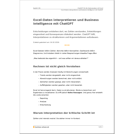Excel-Dateien liefern Zahlen. Berichte liefern Kennzahlen. Dashboards liefern Diagramme. Und trotzdem bleibt in vielen Besprechungen dieselbe Frage offen: „Was bedeutet das eigentlich – und was sollten wir daraus ableiten?“