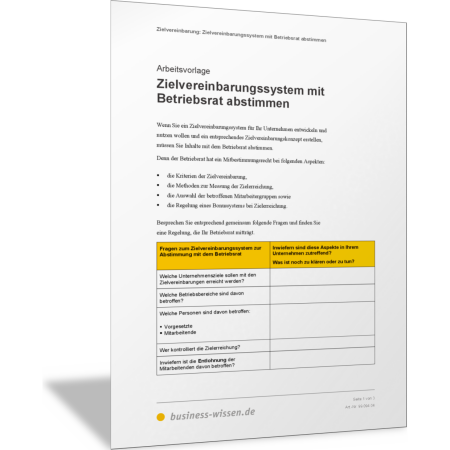 Wenn in Ihrem Unternehmen Führungskräfte mit ihren Mitarbeitenden Ziele vereinbaren sollen, dann sollten Sie die Rahmenbedingungen in einem Konzept oder System für Ihre Zielvereinbarungen regeln und beschreiben. Dieses Konzept und seine Inhalte sind in Teilen mitbestimmungspflichtig – zumindest empfiehlt es sich, das Zielvereinbarungssystem mit dem Betriebsrat abzustimmen. In dieser Vorlage sind die Aspekte benannt, die Sie gemeinsam besprechen und festlegen sollten.