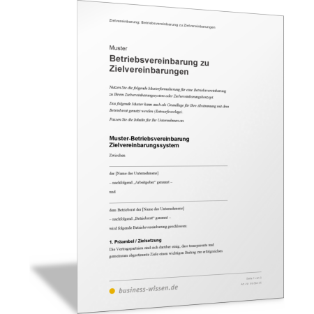 Mit dieser Vorlage erhalten Sie ein Muster für eine Betriebsvereinbarung, in der es um Zielvereinbarungen in Ihrem Unternehmen geht. Damit legen Sie gemeinsam den Rahmen für Ihre Führungskräfte und Mitarbeitenden fest, der für Zielvereinbarungen und dazugehörende Gespräche gelten soll. Nutzen Sie dieses Muster oder Beispiel als Grundlage und Entwurf für Ihre Gespräche mit dem Betriebsrat, passen Sie das Dokument gemeinsam an, und Sie bekommen eine verbindliche Grundlage für Ihr Zielvereinbarungssystem.