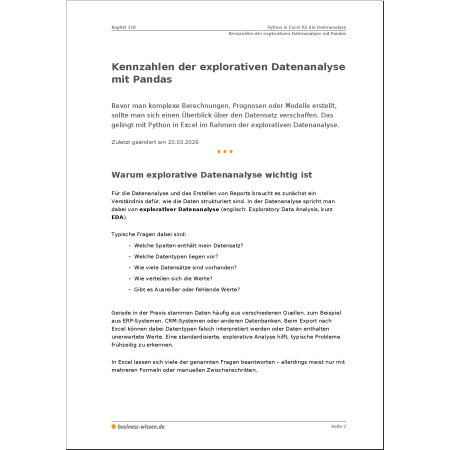 Mit Python und der leistungsstarken Bibliothek Pandas stehen Ihnen dafür zahlreiche Funktionen zur Verfügung. Dieses Dokumentenpaket zeigt Ihnen, wie Sie Ihre Daten effizient untersuchen, aufbereiten und auswerten – auch im Vergleich zu klassischen Excel-Methoden.