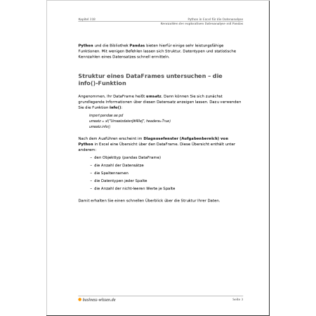 Sie lernen Schritt für Schritt, wie Sie einen DataFrame analysieren, Datentypen interpretieren und zentrale Kennzahlen berechnen. Darüber hinaus erfahren Sie, wie Sie einzelne Spalten gezielt auswerten, Häufigkeiten bestimmen und typische Analyseaufgaben wie Umsatzberechnungen durchführen.