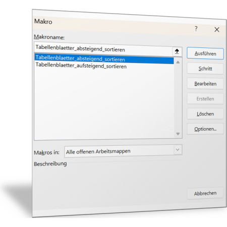 In dieser Excel-Datei sind zwei Makros (VBA-Code) hinterlegt, mit denen Sie alle Tabellenblätter in einer offenen Excel-Datei automatisch sortieren können. Einmal aufsteigend alphabetisch nach Bezeichnung der Tabellenblätter und einmal absteigend.