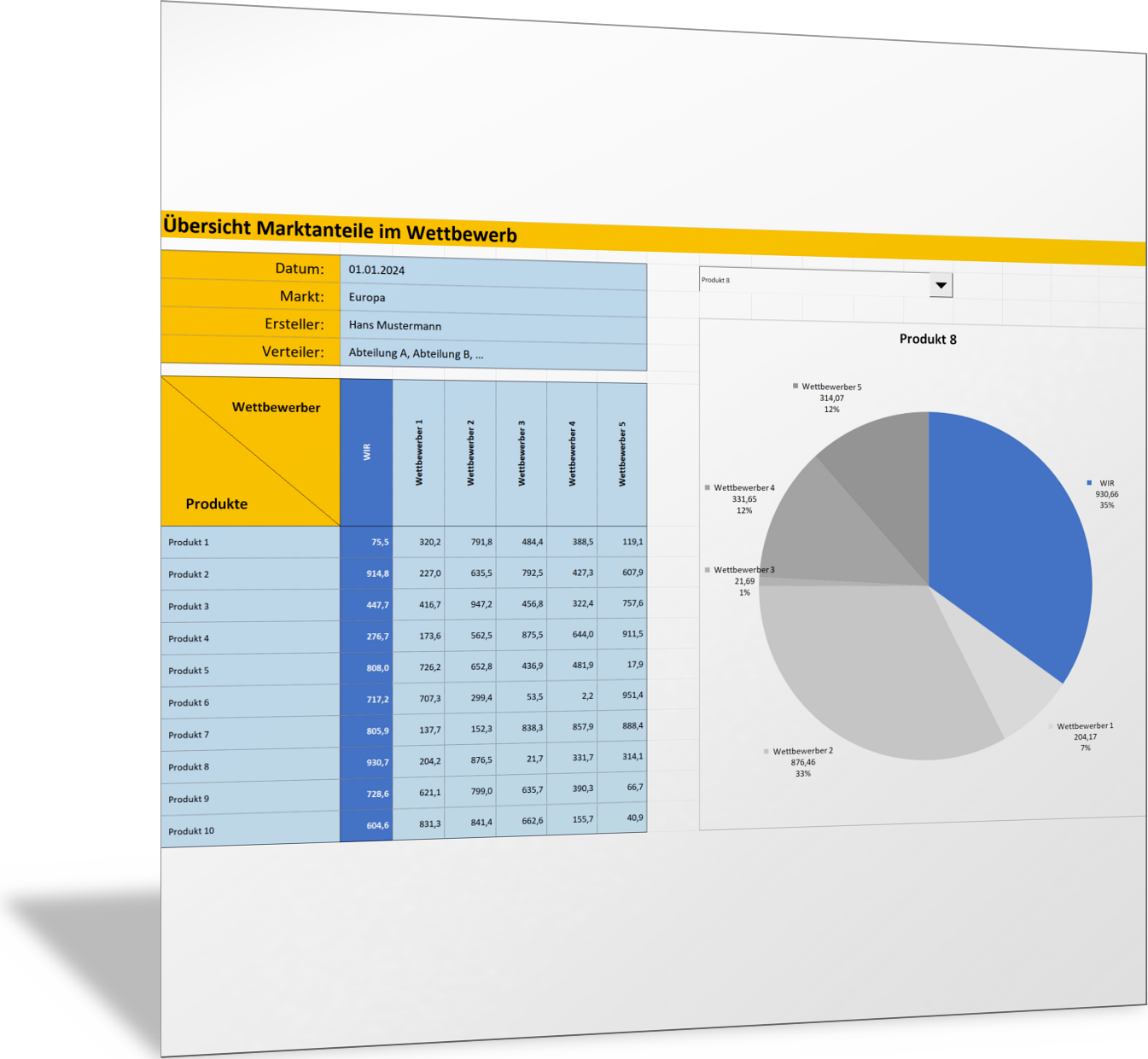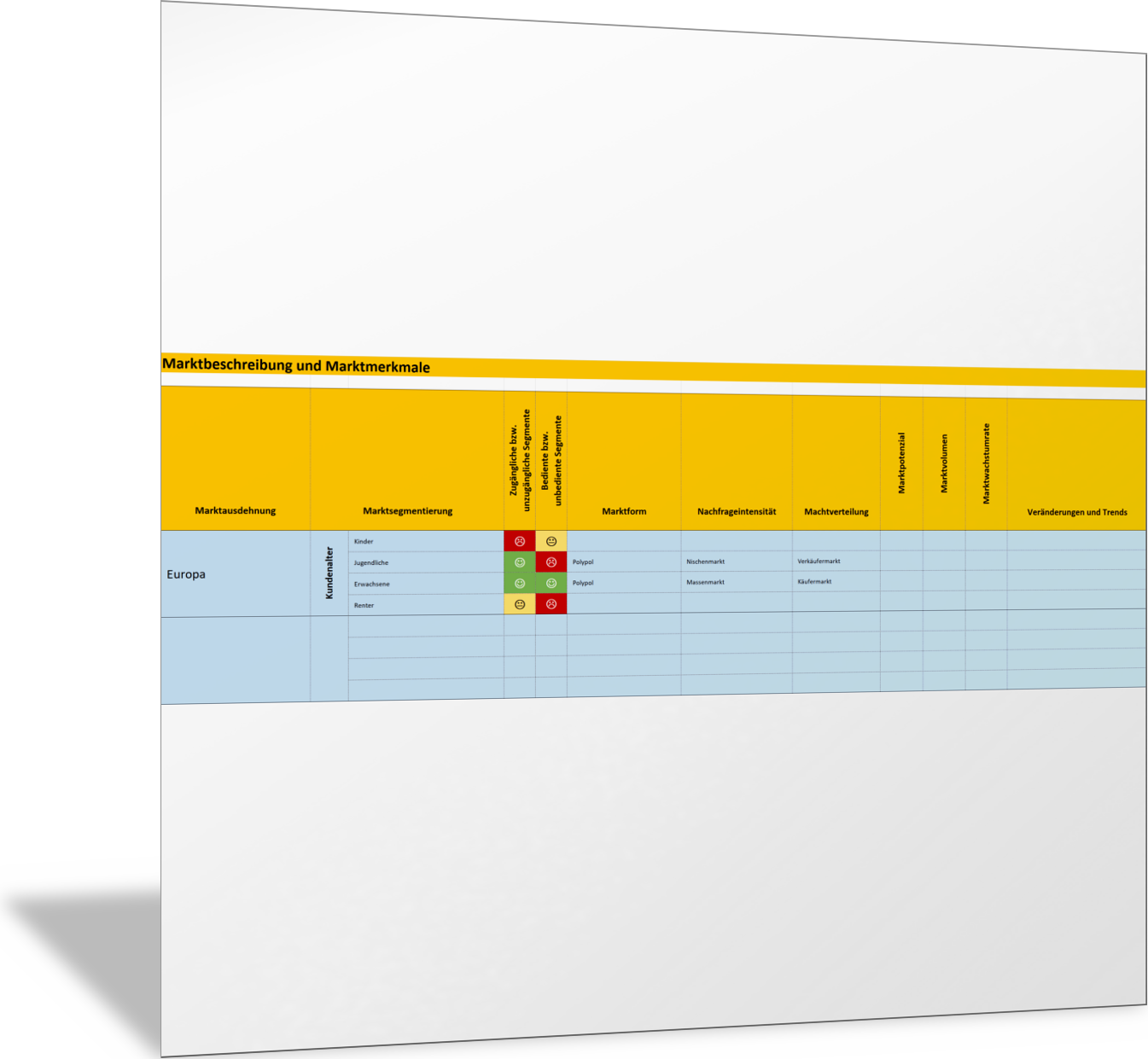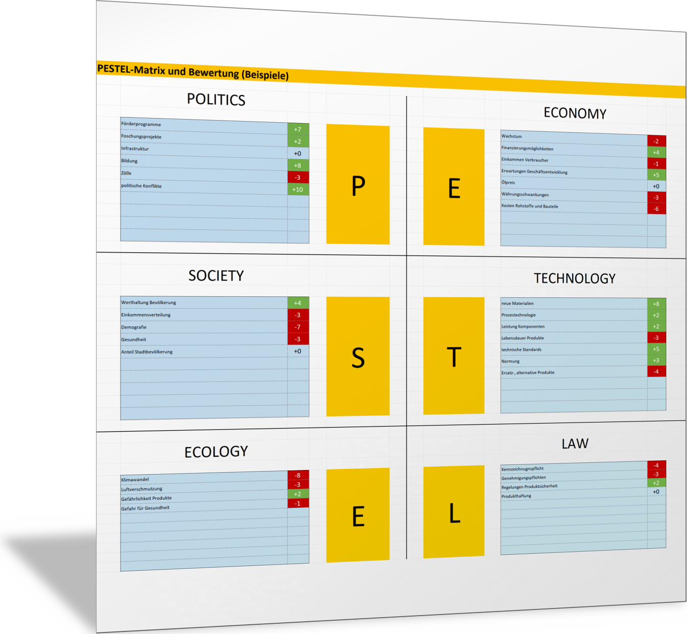 In dieser Excel-Vorlage stellen Sie die wichtigen Einflussfaktoren auf Ihren Markt dar, die Sie im Rahmen der Umfeld-Analyse identifiziert haben. Hier sind die Bereiche betrachtet: Politics, Economy, Social, Technology, Environment und Law (PESTEL). Sie können jeden Faktor mit einem Punktwert bewerten. Die Stärke des Einflusses wird in einem Balkendiagramm dargestellt.