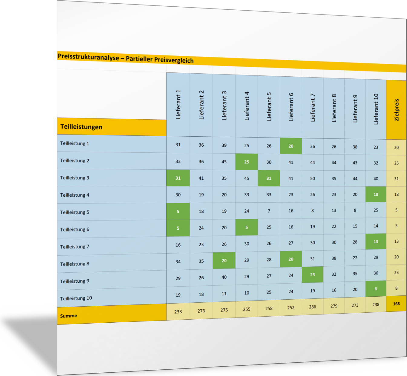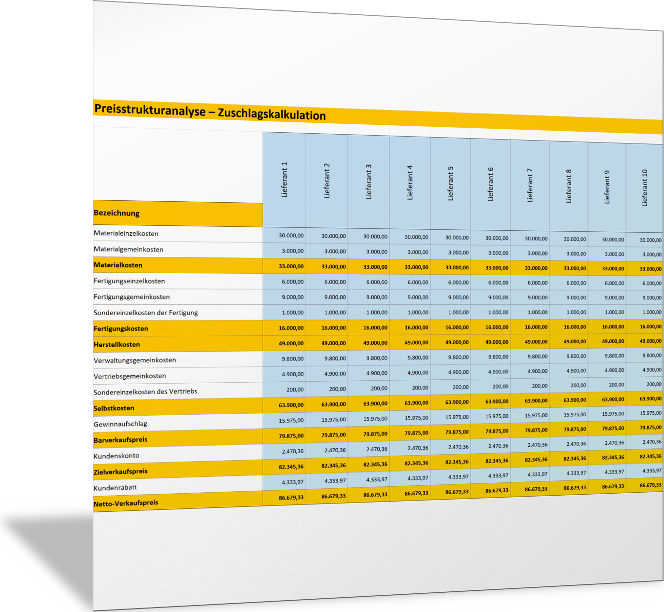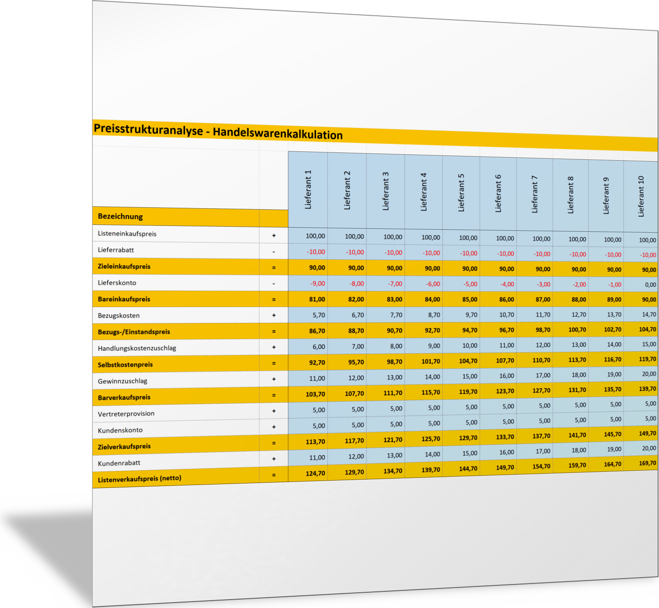 Mit dieser Excel-Vorlage vergleichen Sie als Einkäufer für Ihre Lieferanten und die Handelsware, die Sie von diesen erhalten, unterschiedliche Kostenarten, Rabatte, Provisionen, Skonto und Zuschläge. So erkennen Sie Unterschiede der Kalkulation der Lieferanten, und Sie haben eine bessere Informationsgrundlage für Preisverhandlungen.