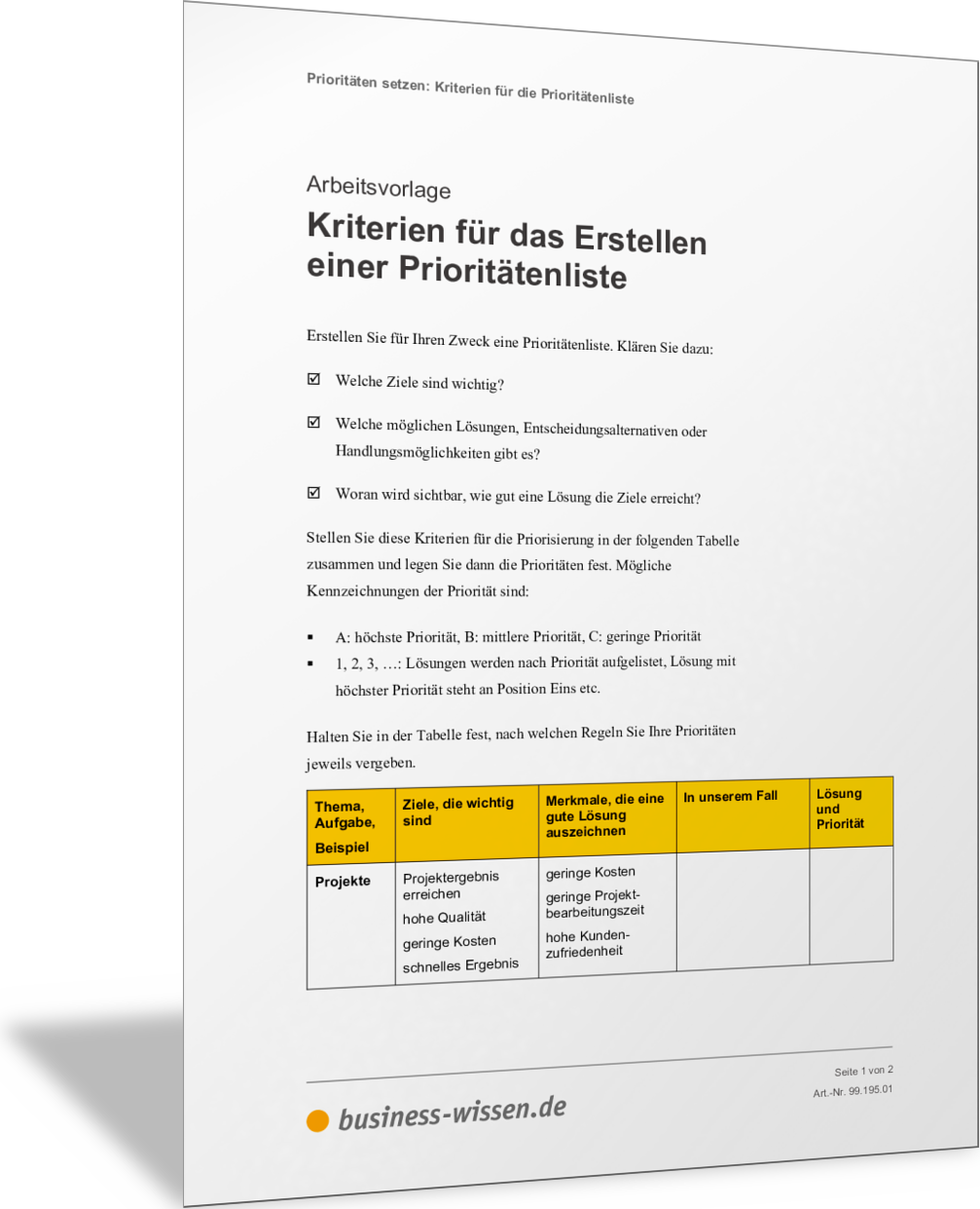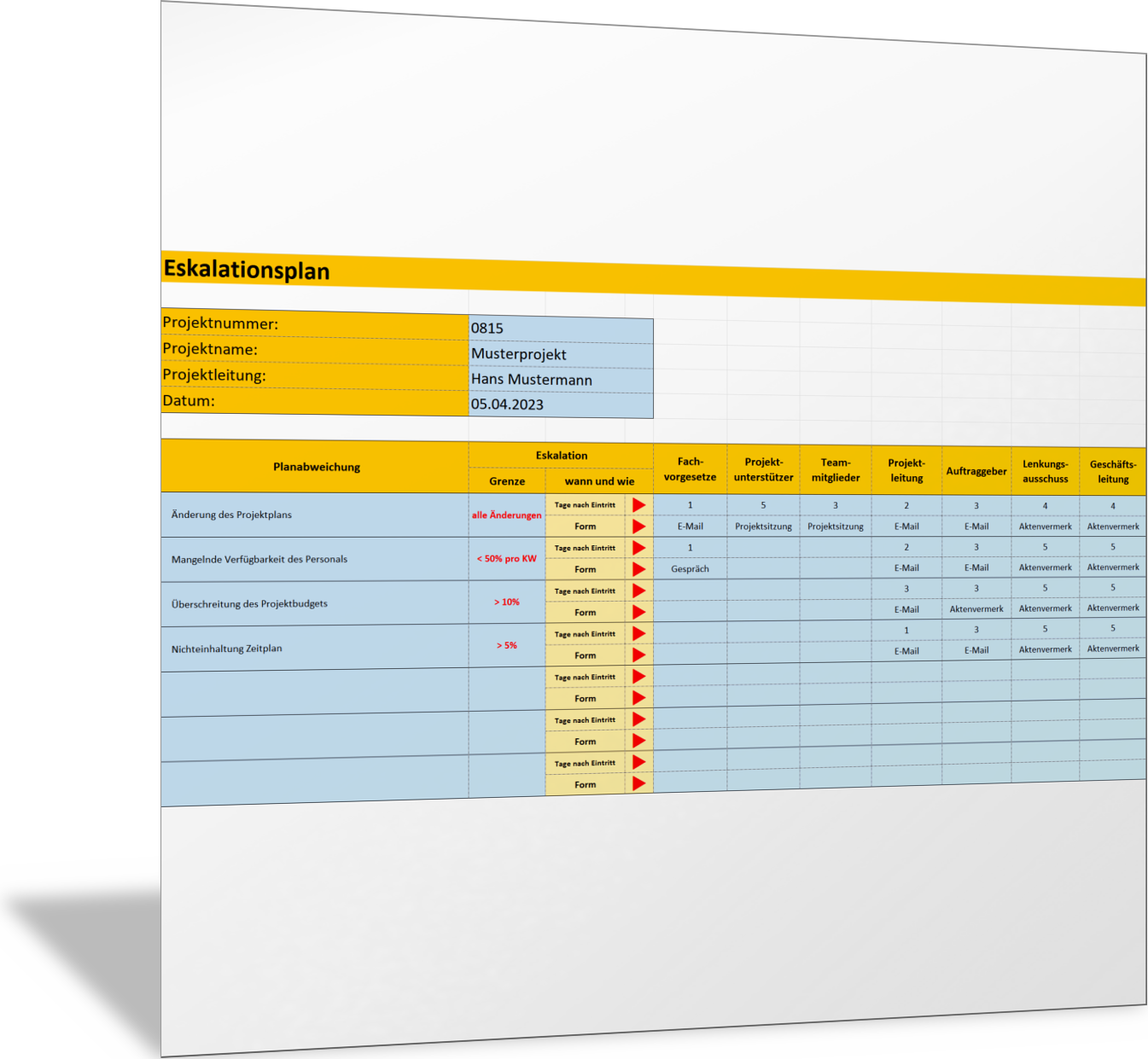 Mit dieser Vorlage erstellen Sie einen Eskalationsplan. Sie halten in der Liste fest, welche Planabweichungen, Probleme oder Risiken in Ihrem Projekt auftauchen können. Dann legen Sie fest, bei welchem Ereignis oder bei welcher Abweichung Sie einschreiten und die Eskalation einleiten müssen. Dazu legen Sie fest, wen Sie über welche Wege (Form) informieren. So wissen alle im Projekt, was bei Problemen und Planabweichungen zu tun ist.