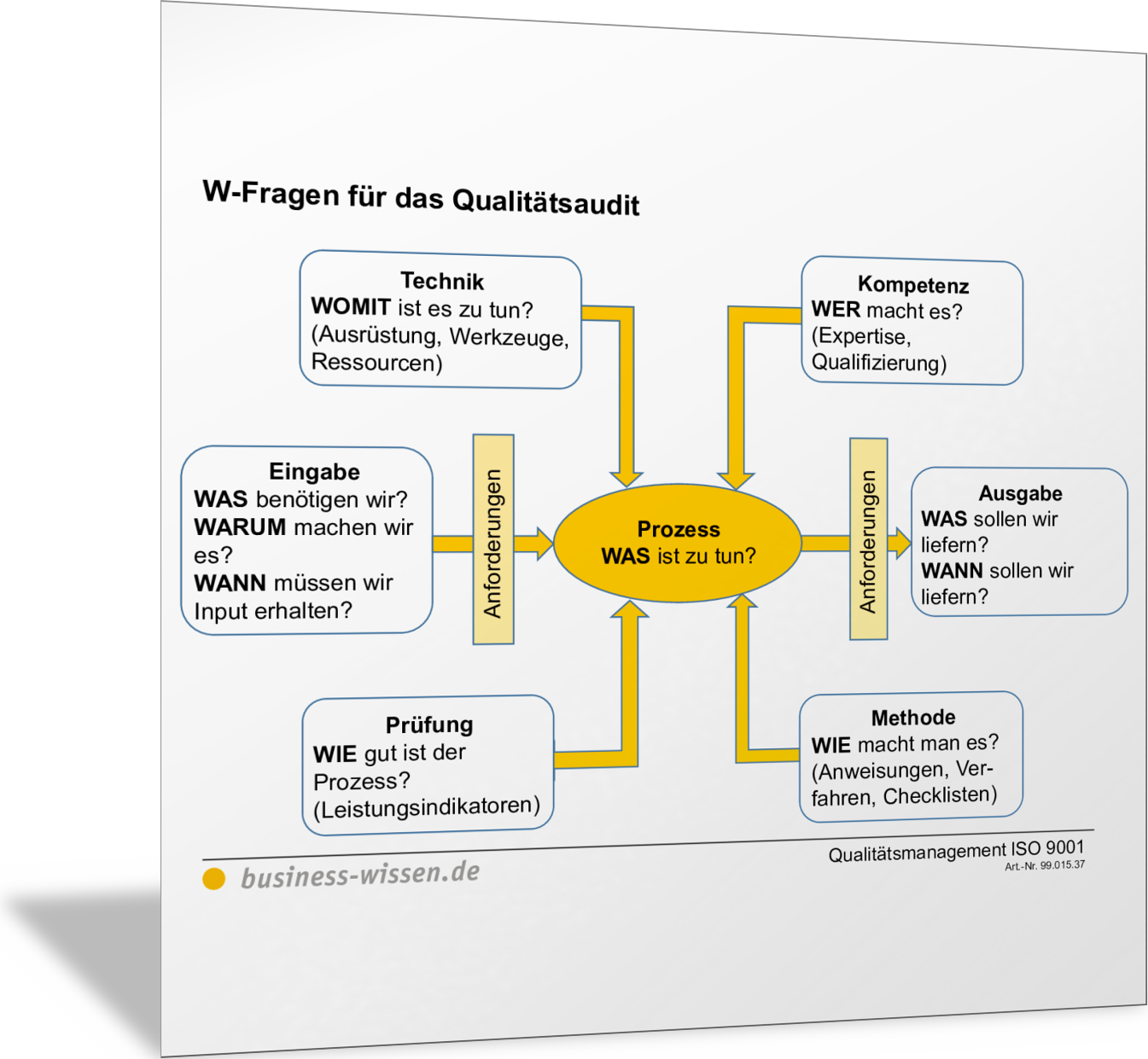 VorlageÜbersicht W-Fragen für das Qualitätsaudit (Turtle-Diagramm)Die Übersicht zeigt, welche W-Fragen im Rahmen eines Qualitäts-Audits wichtig sind und beantwortet werden müssen. Die Fragen bilden auch den Prozesscharakter ab, der für das Qualitätsmanagement maßgeblich ist. Die Art der Darstellung entspricht dem sogenannten Turtle-Diagramm.