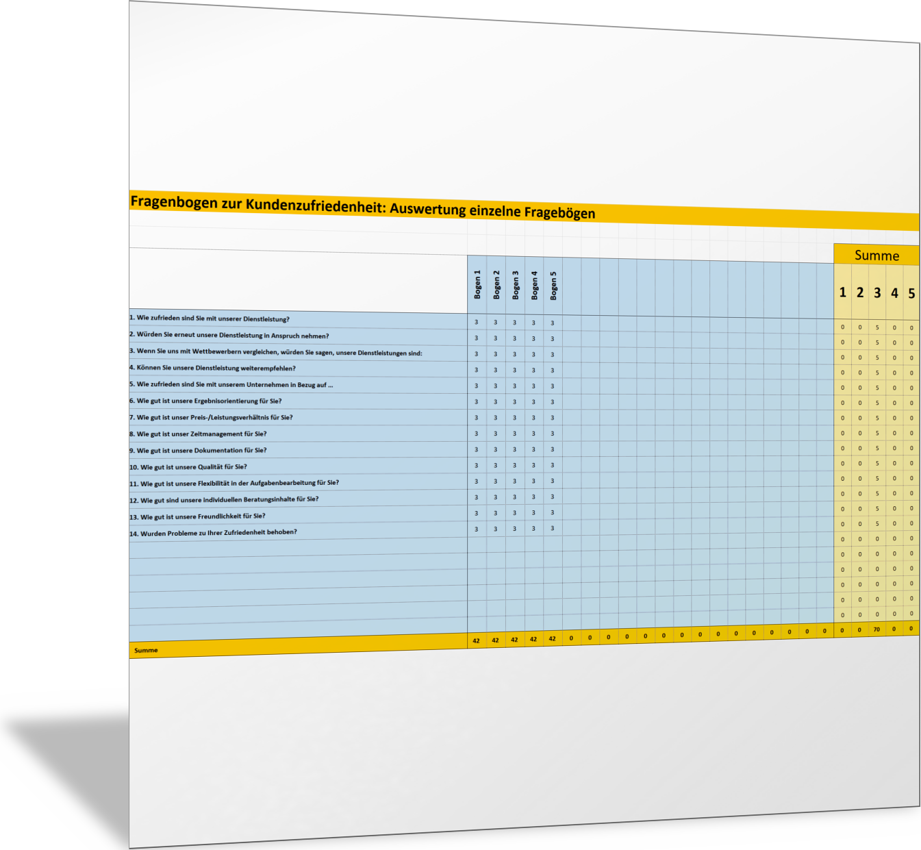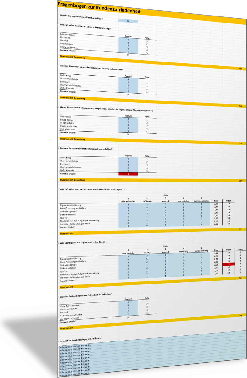 Excel-VorlageAuswertung Fragebogen zur KundenzufriedenheitWenn Sie Ihre Kunden zur Zufriedenheit, zu Qualität der Produkte und Dienstleistungen oder zum Service befragen, dann sollten Sie die Antworten der Kunden erfassen und auswerten. Mit dieser Excel-Vorlage können Sie die Rückmeldungen erfassen und auszählen. Für die einzelnen Fragen wird ein Mittelwert berechnet und dargestellt. Sie können die Vorlage auch als Grundlage für einen Fragebogen nutzen.