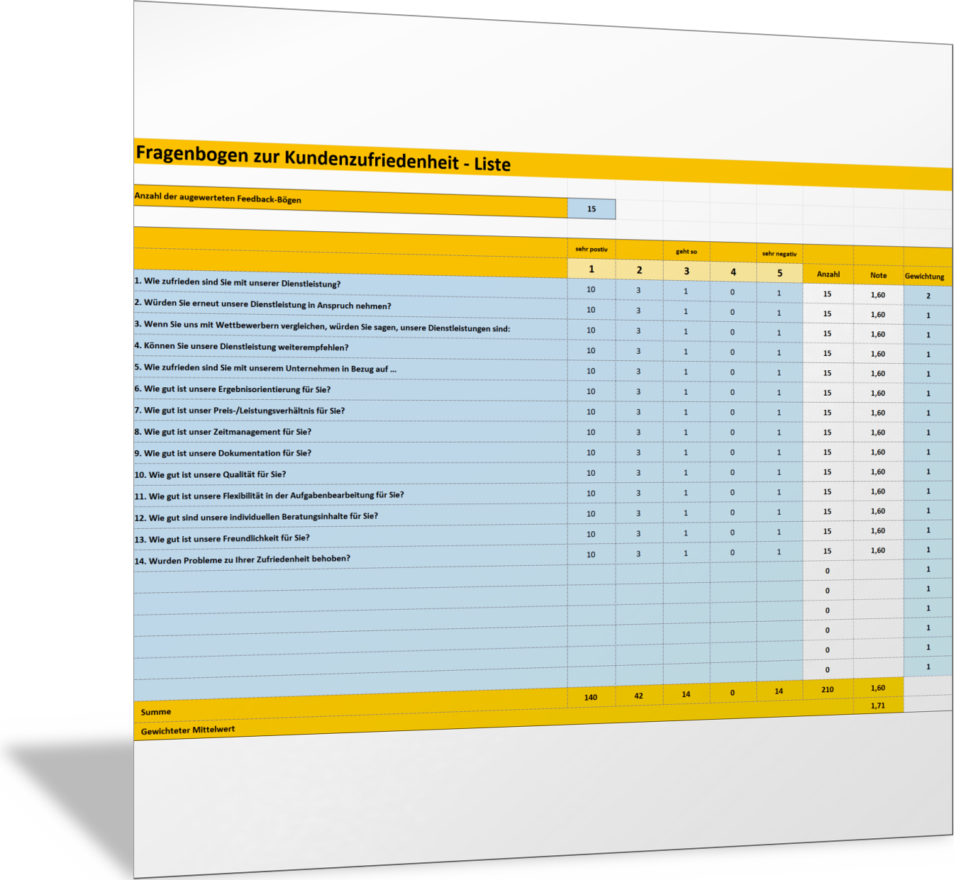 Excel-VorlageAuswertung Fragebogen zur Kundenzufriedenheit mit FragelisteWenn Sie Ihre Kunden zur Zufriedenheit, zu Qualität der Produkte und Dienstleistungen oder zum Service befragen, dann sollten Sie die Antworten der Kunden erfassen und auswerten. Mit dieser Excel-Vorlage können Sie die einzelnen Fragen als Liste und die Antworten auf einer Skala von 1 bis 5 erfassen. Für die einzelnen Fragen wird ein Mittelwert berechnet und dargestellt. Sie können für eine Gesamtbewertung die Punktwerte auch gewichten.