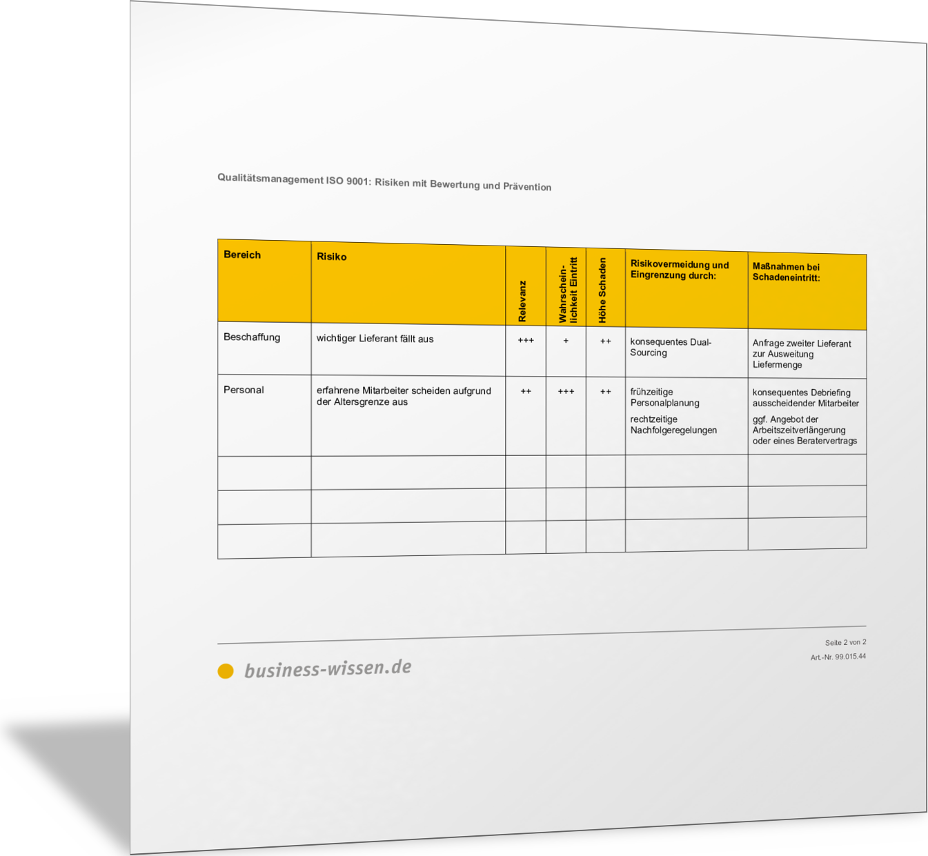 VorlageRisiken im Qualitätsmanagement mit Bewertung und PräventionMit dieser Vorlage erstellen Sie einer Liste aller für das Qualitätsmanagement relevanten Risiken und Gefahren. Sie benennen das Risiko, bewerten es nach Relevanz für das Unternehmen, nach Eintrittswahrscheinlichkeit und Schadenshöhe. Gleichzeitig halten Sie fest, was Sie zur Prävention unternehmen und welche Maßnahmen bei Schadenseintritt durchgeführt werden.