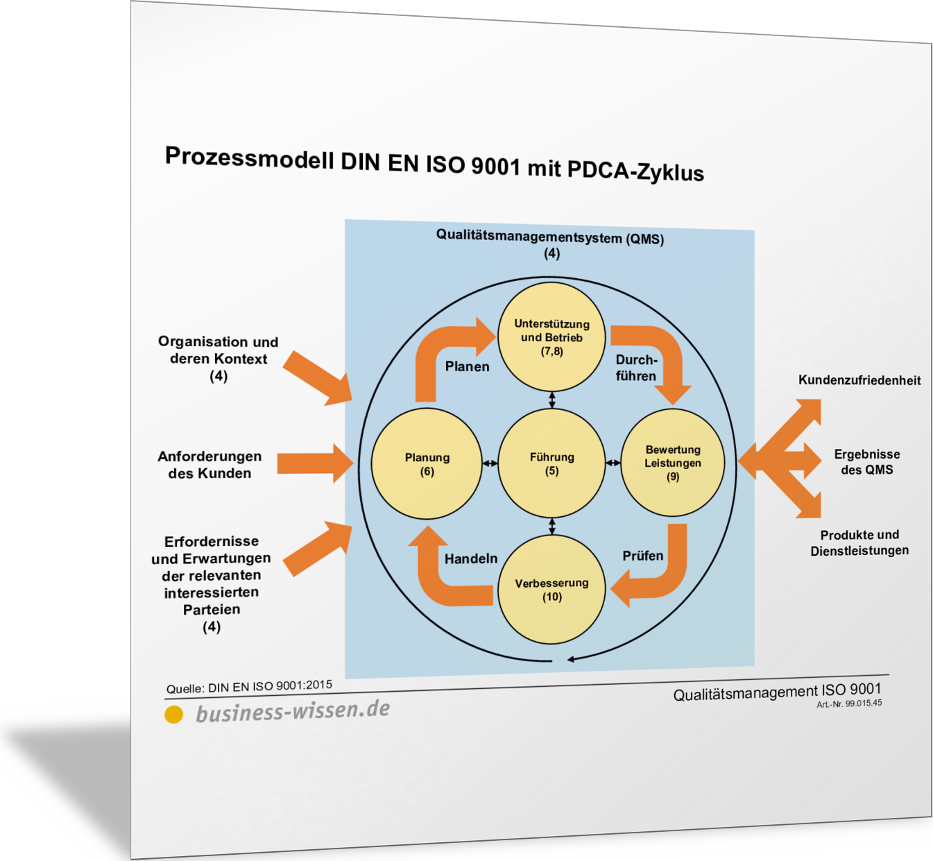 VorlageProzessmodell DIN EN ISO 9001 mit PDCA-ZyklusDie Grafik zeigt in der Übersicht, wie die einzelnen Elemente der DIN EN ISO 9001 mit dem PDCA-Zyklus verknüpft ist. Die Prozessschritte Plan, Do, Check, Act finden sich in den Abschnitten 6, 7, 8, 9 und 10 der Norm ausgeführt.