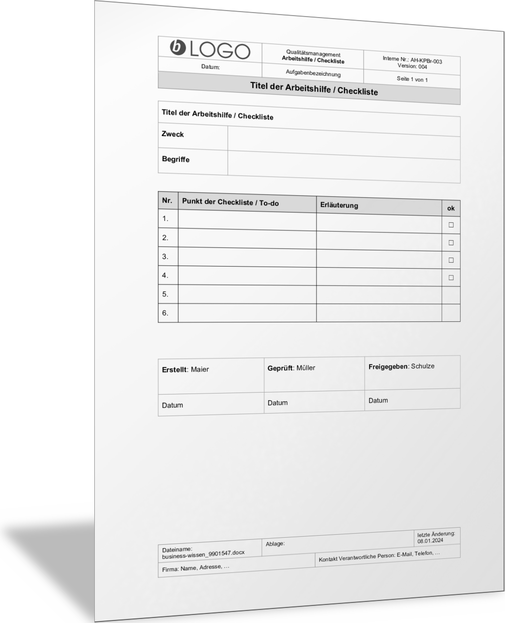 FormularArbeitshilfe oder Checkliste erstellen für Aufgaben und MaßnahmenplanungMit diesem Formular können Sie einfache Arbeitshilfen und Checklisten erstellen. Sie benennen dazu alle Aktivitäten und Informationen, die der Nutzer der Arbeitshilfe wissen muss, um eine Aufgabe oder eine Tätigkeit korrekt zu erfüllen und um nichts zu vergessen. In diesem Formular werden diese Informationen in Form einer Tabelle dargestellt.