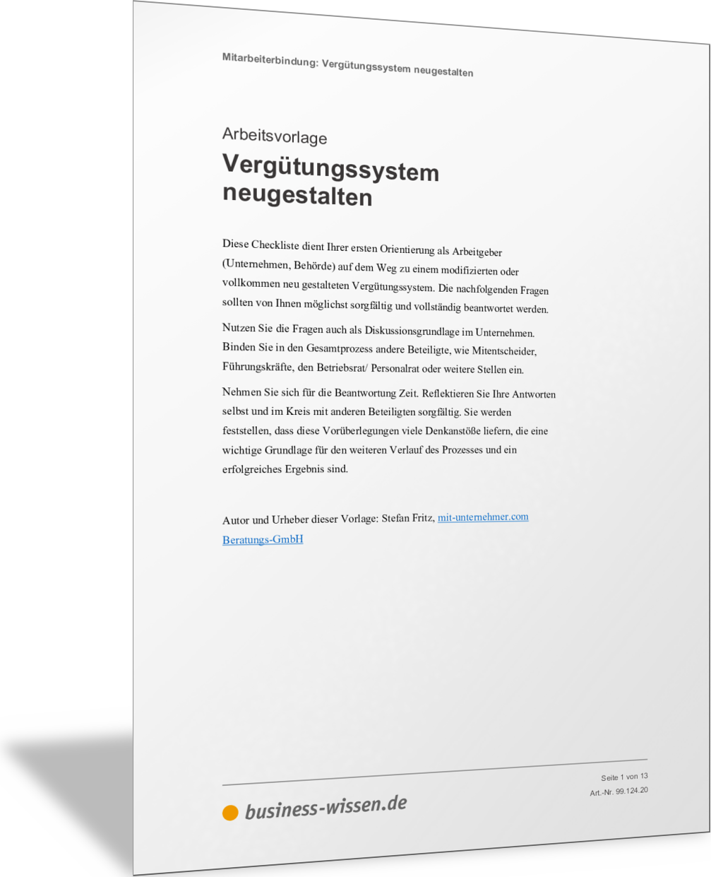 VorlageVergütungssystem neugestaltenMit dieser Arbeitsvorlage bereiten Sie sich auf die Einführung eines neuen Vergütungssystems oder die Änderung eines bestehenden Vergütungssystems vor. Beantworten Sie die genannten Fragen und erläutern Sie die unterschiedlichen Komponenten Ihres bisherigen und des geplanten Vergütungssystems für Ihre Beschäftigten mit den möglichen Stärken und Schwächen. So schaffen Sie eine gute Diskussionsgrundlage, um für Ihr Unternehmen, seine Rahmenbedingungen und seine Ziele ein passendes Vergütungssystem für Lohn und Gehalt zu entwickeln.