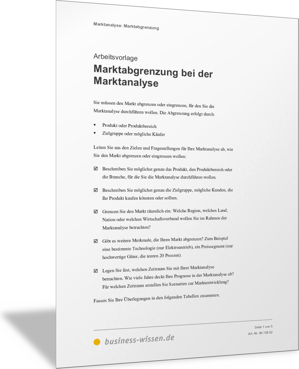 VorlageMarktabgrenzung bei der MarktanalyseEine Marktanalyse bezieht sich immer auf einen abgegrenzten und klar definierten Markt. Sie grenzen diesen ab, indem Sie das Produkt oder Geschäftsmodell beschreiben, für das die Marktanalyse erstellt werden soll. Weitere Kriterien zur Marktabgrenzung können sein: die Zielgruppe oder der Raum (Region, Land, Wirtschaftsregion). Die dabei relevanten Informationen zur Marktabgrenzung stellen Sie in dieser Vorlage zusammen.