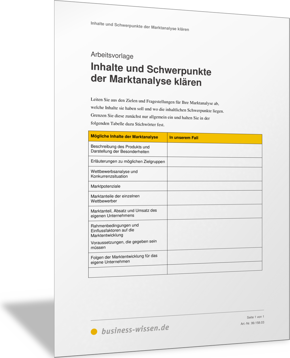 VorlageInhalte und Schwerpunkte der Marktanalyse klärenIn dieser Vorlage sind die möglichen Inhalte einer Marktanalyse benannt. Sie erläutern damit, welche Aspekte bei Ihrer Marktanalyse wichtig sind und was Sie im Detail erstellen und beschreiben wollen. Mithilfe dieser Vorlage erstellen Sie eine Stoffsammlung für Ihre Marktanalyse.