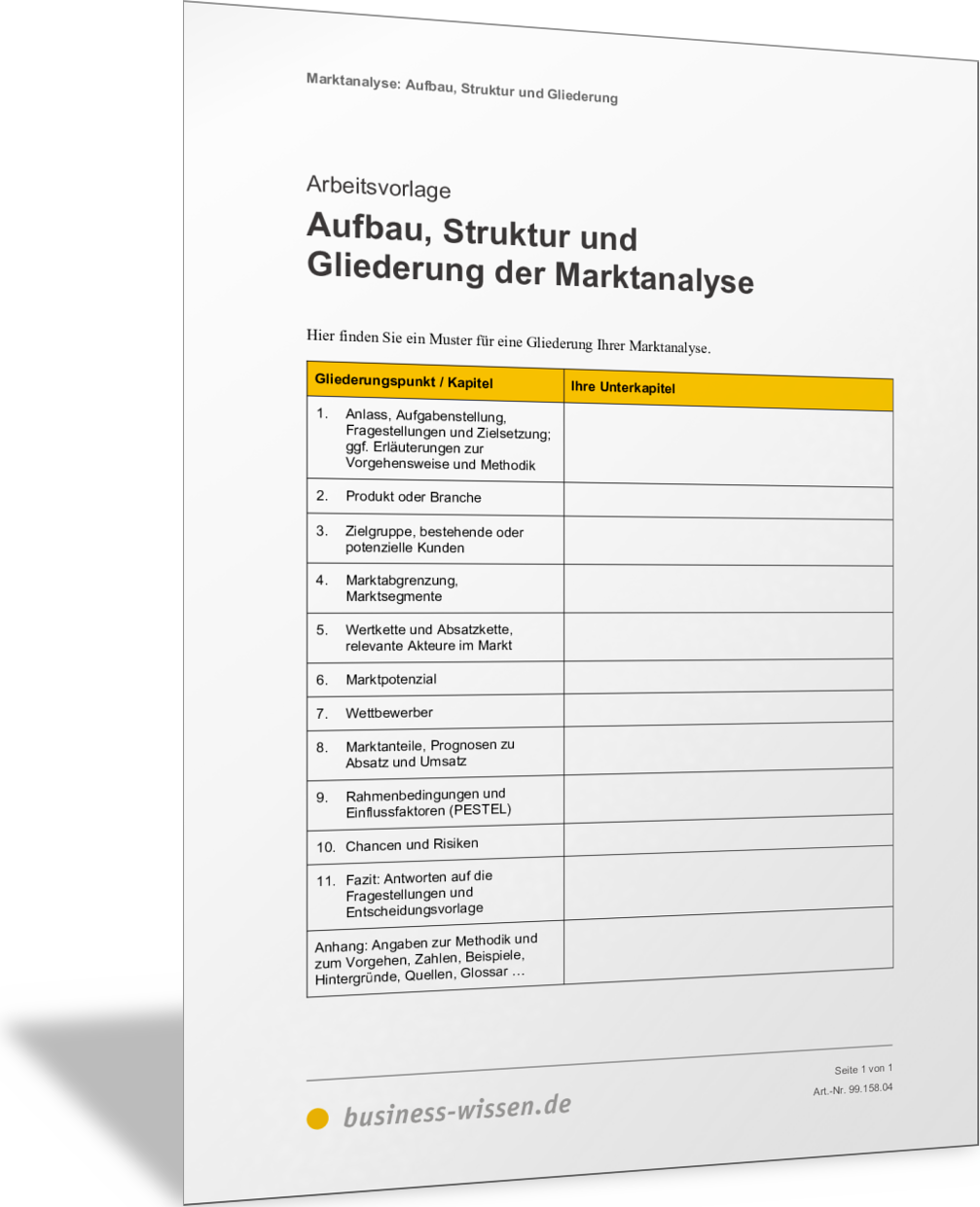 VorlageAufbau, Struktur und Gliederung der MarktanalyseIn dieser Vorlage finden Sie eine Gliederung für Ihre Marktanalyse. Die einzelnen Kapitel sind benannt, Sie können je nach Fragestellung und Inhalt Ihrer Marktanalyse die Unterkapitel ergänzen und benennen. So haben Sie eine fertige Gliederung und Struktur für Ihre individuelle Marktanalyse und für das Erstellen Ihrer Marktstudie.