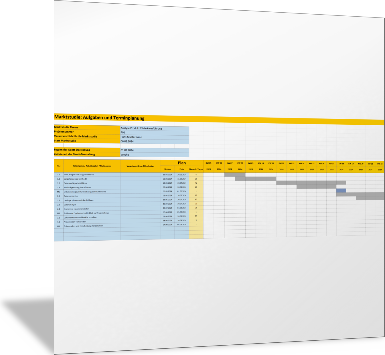 Excel-VorlageArbeitsplan für eine Marktanalyse mit BalkendiagrammIn dieser Excel-Vorlage stellen Sie alle Aufgaben zusammen, die Sie durchführen müssen, um Ihre Marktanalyse zu erstellen. Sie planen jede Aufgabe zeitlich ein und erkennen anhand eines Balkenplans (Gantt-Diagramm), welche Aufgaben in welchem Zeitraum zu erfüllen sind. Da die Durchführung einer Marktanalyse aufwendig ist, sollten die einzelnen Arbeitsschritte gut aufeinander abgestimmt sein. Mit dieser Vorlage behalten Sie die Übersicht.