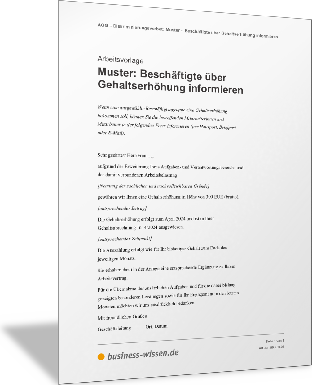 VorlageMuster: Beschäftigte über Gehaltserhöhung informierenIn dieser Vorlage finden Sie eine Musterformulierung, mit der Sie Beschäftigte Ihres Unternehmens über eine gewährte Gehaltserhöhung informieren. Wichtig dabei ist, dass Sie die genauen fachlichen und sachlichen Gründe benennen, warum Sie die Gehaltserhöhung gewähren – insbesondere dann, wenn nur ausgewählte Mitarbeiterinnen und Mitarbeiter oder bestimmte Mitarbeitergruppen diese Gehaltserhöhung bekommen sollen. Nutzen Sie diese Musterformulierung und passen Sie diese an den benannten Stellen auf Ihre Situation an.