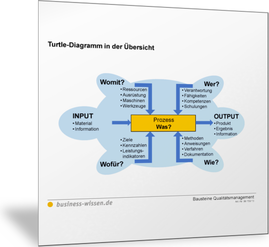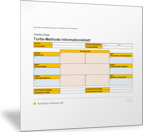 In diesem Formblatt halten Sie die Informationen für Ihr Turtle-Diagramm für Ihr Qualitätsmanagement fest. Sie benennen den Prozess, beschreiben kurz die Aktivitäten und benennen dann stichwortartig: Input, Output, Ressourcen (womit), Methoden (wie), Rollen (wer) und Leistungsmerkmale (wofür, wie gut). Außerdem benennen Sie Risiken, die mit diesem Prozess verbunden sein können. In der Vorlage werden diese Informationen in Form eines Turtle-Diagramms dargestellt.