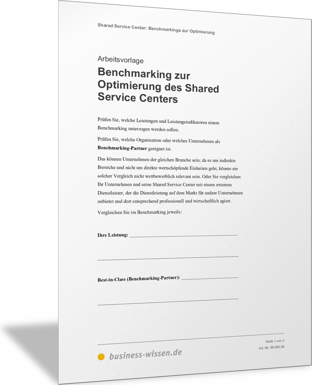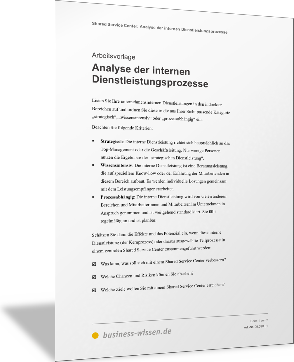 Mit dieser Vorlage überprüfen Sie, welche Gründe und Kriterien dafür oder dagegen sprechen, dass ein indirekter Bereich Ihres Unternehmens, der interne Dienstleistungen erbringt, als Shared Service Center, also zentral, geführt wird. Die Gründe können sein: Kosten sparen, Servicequalität verbessern, Prozesse vereinfachen, Flexibilität erhöhen. Dazu finden Sie in der Vorlage eine Reihe von Kriterien und Aspekten, die Sie für Ihre internen Dienstleistungen prüfen und klären. Das zeigt, warum und in welchen Bereichen Shared Service Center eine Verbesserung bringen könnten.