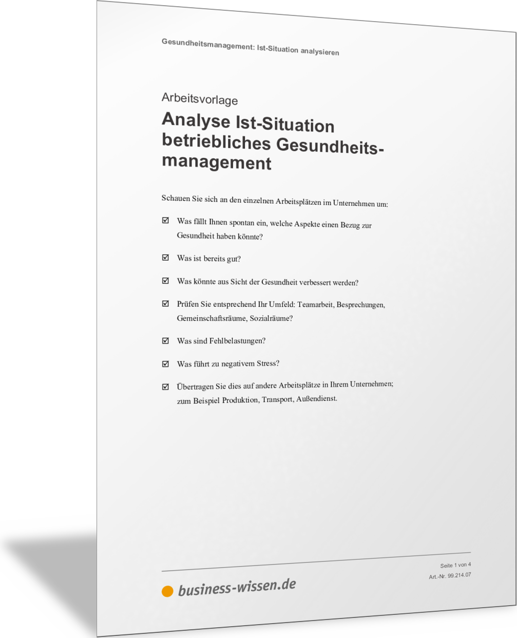 In dieser Vorlage sind Handlungsfelder für das betriebliche Gesundheitsmanagement zusammengestellt. Sie erfahren, was zum Gesundheitsmanagement aus Sicht von Unternehmen, Beschäftigten, Gesundheitsschutz, Arbeitsschutz und Gesundheitsförderung gehört und was Sie jeweils tun können. Die Handlungsfelder basieren auf Empfehlungen von Experten zum Gesundheitsmanagement. Planen Sie mit der Vorlage, in welchen Bereichen Sie aktiv werden und was Sie dazu umsetzen wollen.