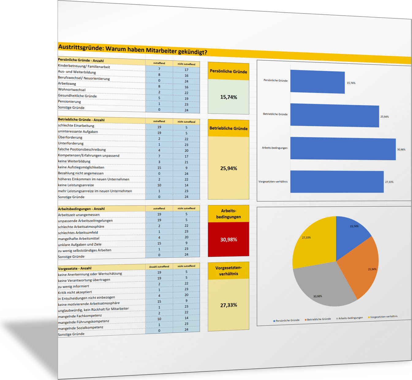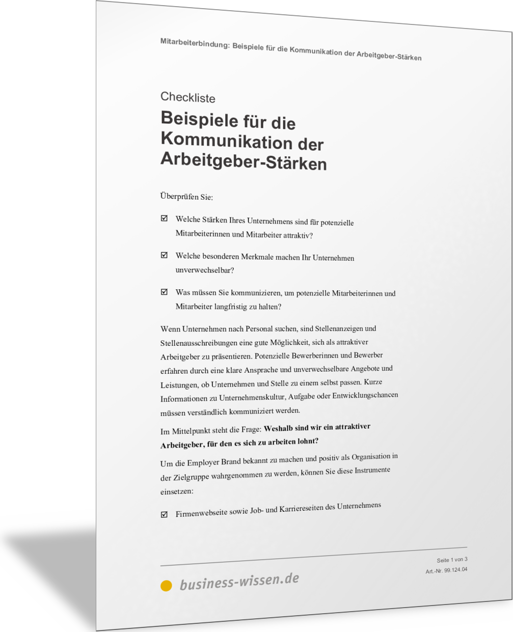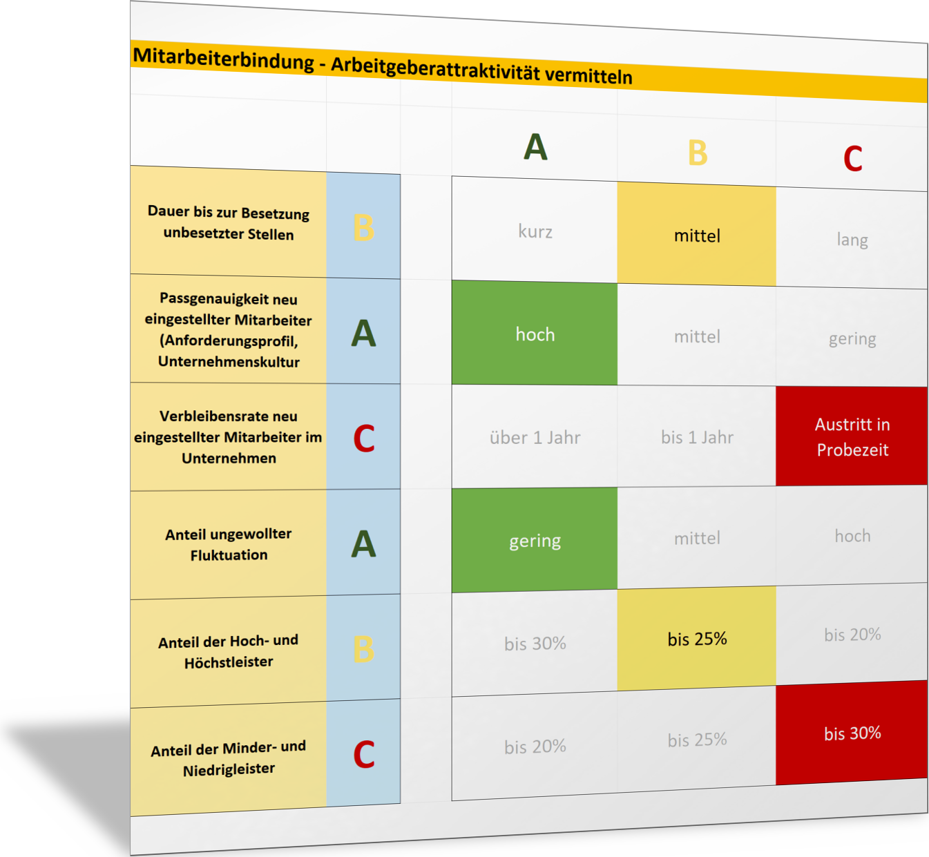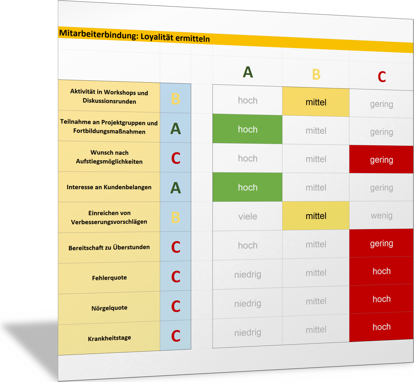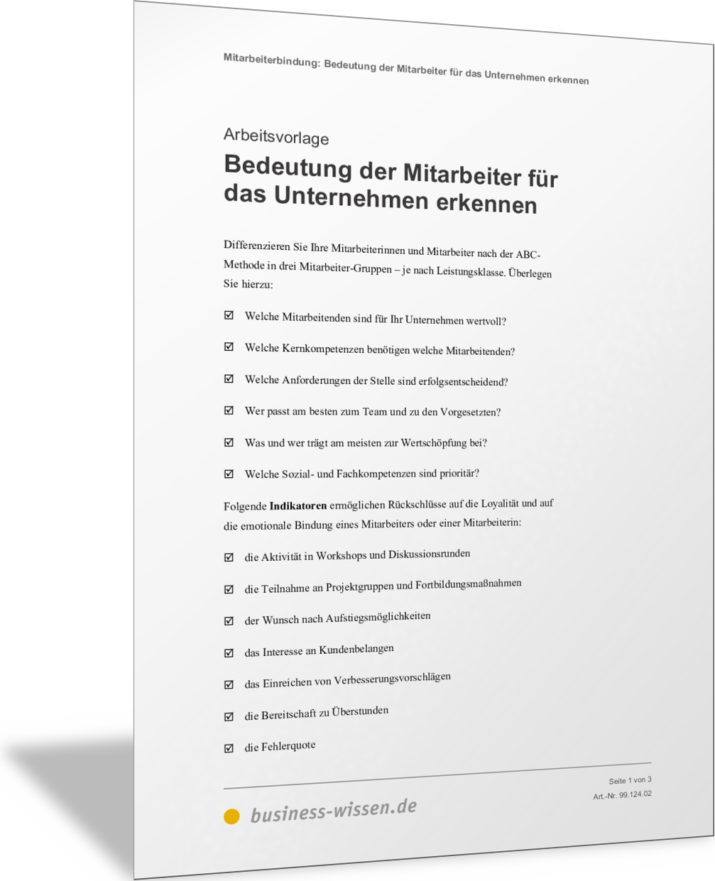 Differenzieren Sie Ihre Mitarbeiterinnen und Mitarbeiter nach der ABC-Methode in drei Mitarbeiter-Gruppen. Dazu beurteilen Sie die Leistungen, das Verhalten, das Engagement, die Motivation, die Identifikation mit dem Unternehmen, die Kundenorientierung und weitere Aspekte. In der Vorlage finden Sie zu diesen Aspekten einzelne Merkmale, anhand derer Sie die Mitarbeitenden in eine der drei Gruppen einteilen können. So erkennen Sie, welche Mitarbeitenden Sie (unbedingt) binden sollten und wer die Leistungsträger sind.