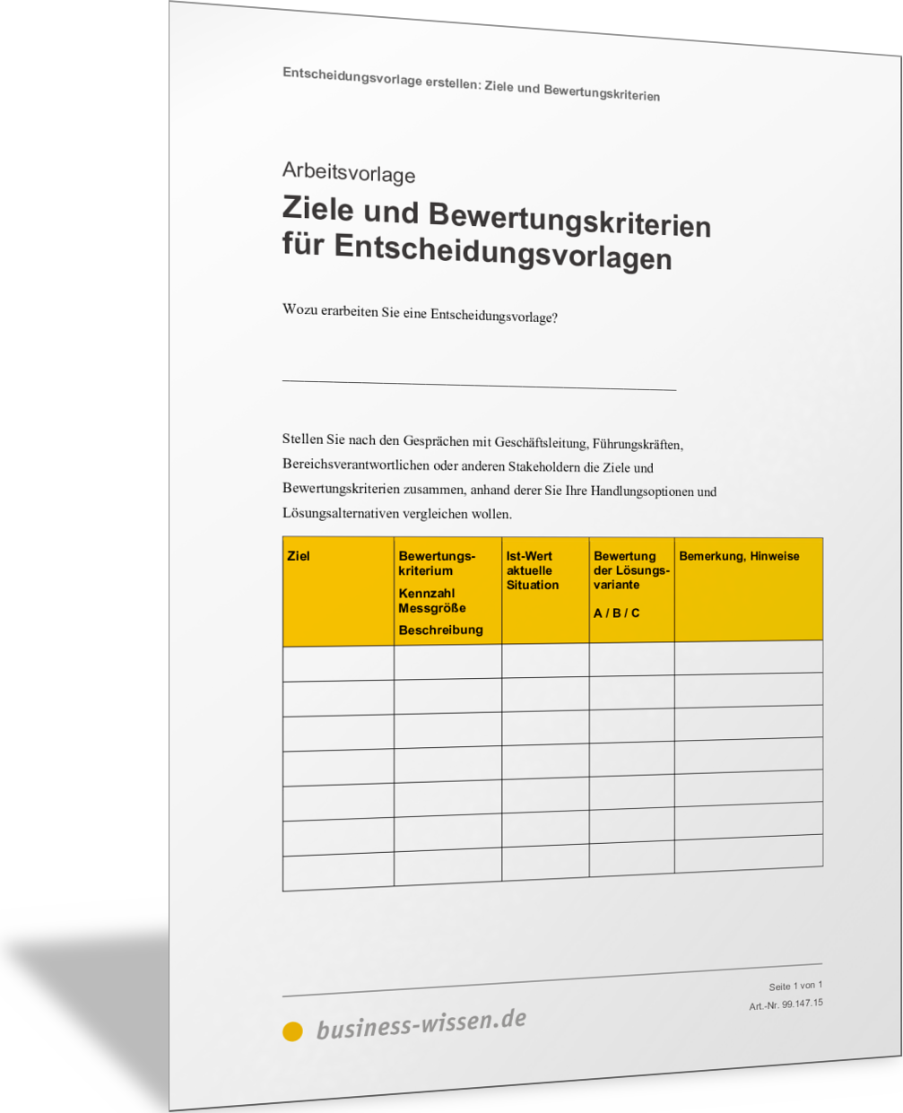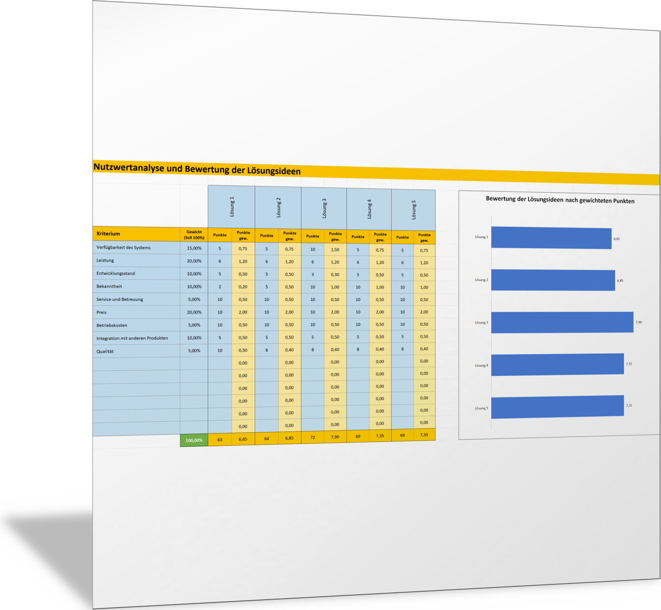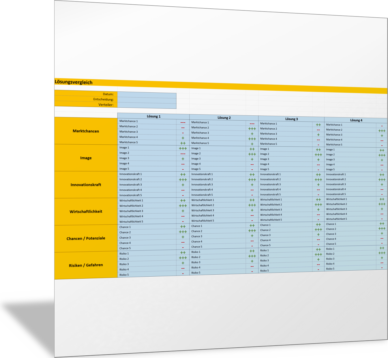 In dieser Excel-Vorlage stellen Sie alle relevanten Bewertungskriterien für Ihre Lösungen, die Sie im Rahmen der Ausarbeitung Ihrer Entscheidungsvorlage gefunden haben, in einer Tabelle nebeneinander vor. Sie finden so die jeweils wichtigen Argumente, die für oder gegen eine Lösung oder Handlungsoption sprechen. Wichtige Kriterienbereiche, die erfasst werden können, sind: Marktchancen, Image, Innovationskraft, Wirtschaftlichkeit, Chancen, Risiken.