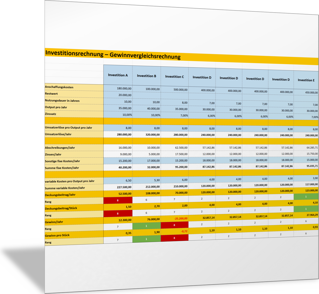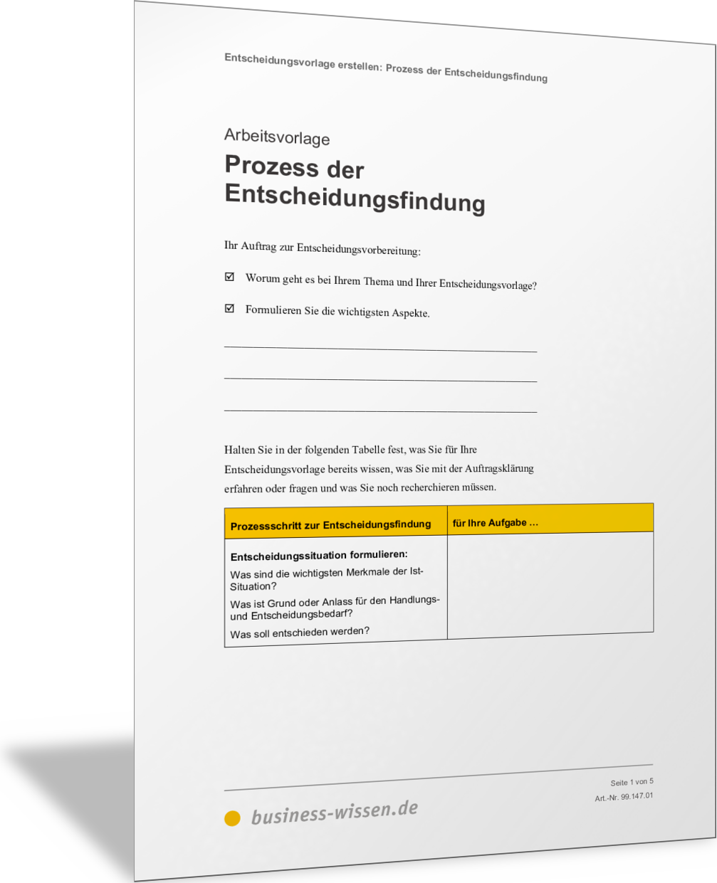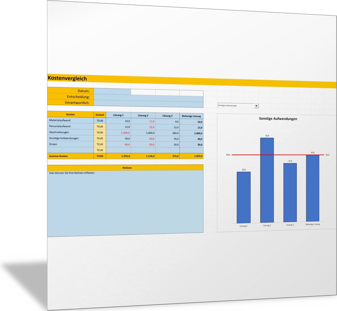 In dieser Excel-Vorlage stellen Sie alle relevanten Bewertungskriterien für Ihre Lösungen, die Sie im Rahmen der Ausarbeitung Ihrer Entscheidungsvorlage gefunden haben, in einer Tabelle nebeneinander vor. Sie finden so die jeweils wichtigen Argumente, die für oder gegen eine Lösung oder Handlungsoption sprechen. Wichtige Kriterienbereiche, die erfasst werden können, sind: Marktchancen, Image, Innovationskraft, Wirtschaftlichkeit, Chancen, Risiken.