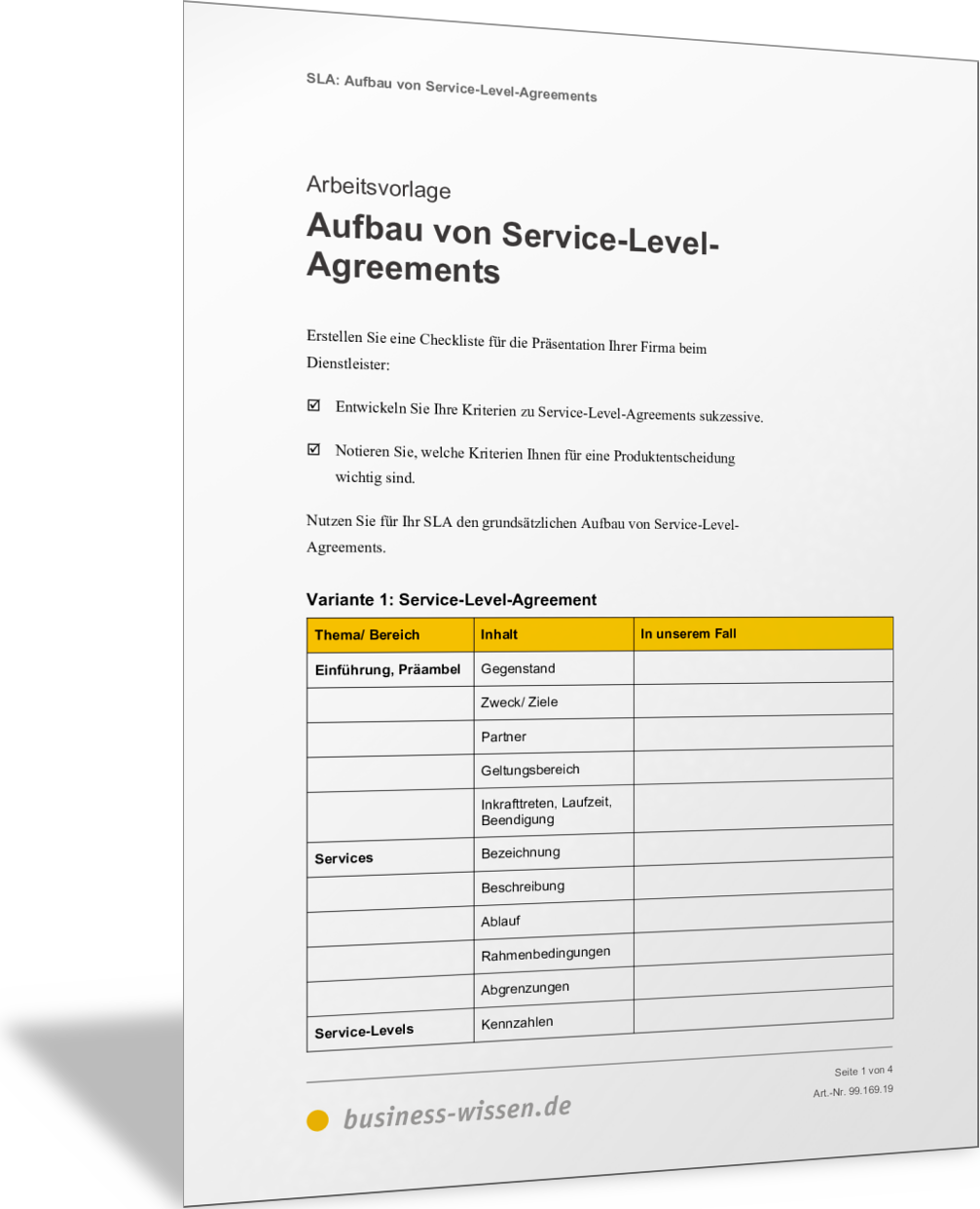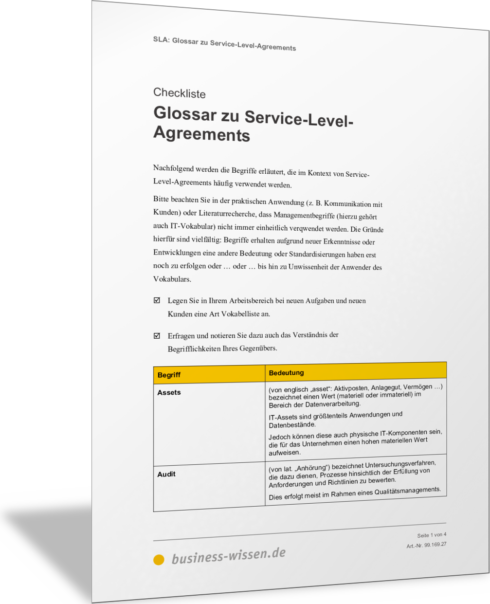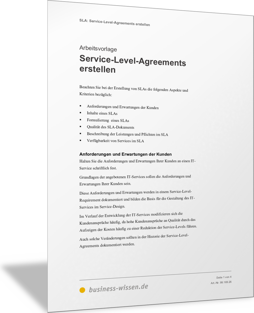 Beachten Sie bei der Erstellung von Service-Level-Agreements die folgenden Aspekte und Kriterien: Anforderungen und Erwartungen der Kunden, Inhalte eines SLAs, Formulierung eines SLAs, Qualität des SLA-Dokuments, Beschreibung der Leistungen und Pflichten im SLA, Verfügbarkeit von Services im SLA. Zu diesen Aspekten und Kriterien erläutert diese Vorlage, worauf zu achten ist. Nutzen Sie die Vorlage, um Ihre bestehenden Service-Level-Agreements zu überprüfen im Hinblick auf Vollständigkeit, Verständlichkeit, Eindeutigkeit etc. Erstellen Sie neue Service-Level-Agreements mit den genannten Kriterien.