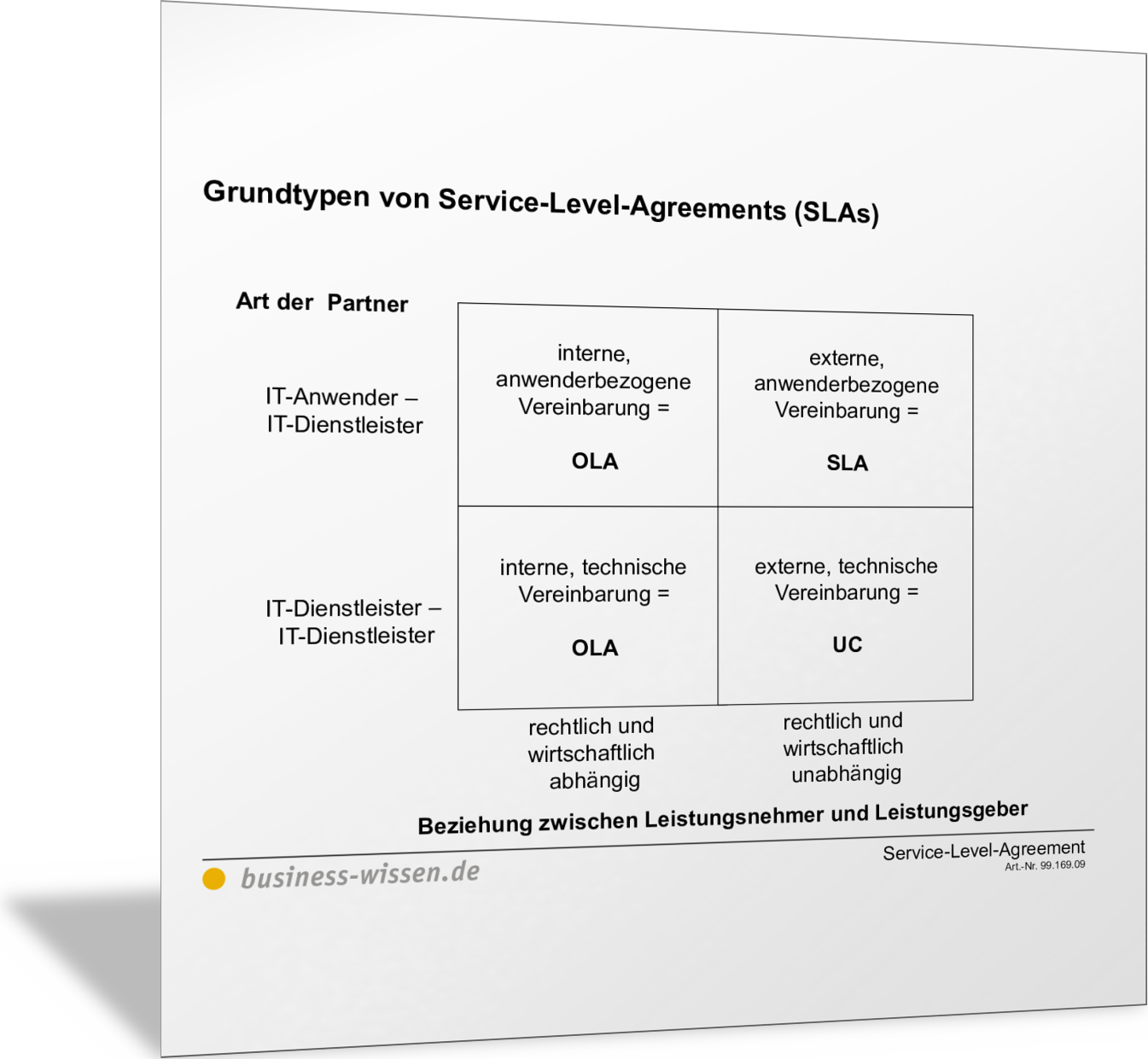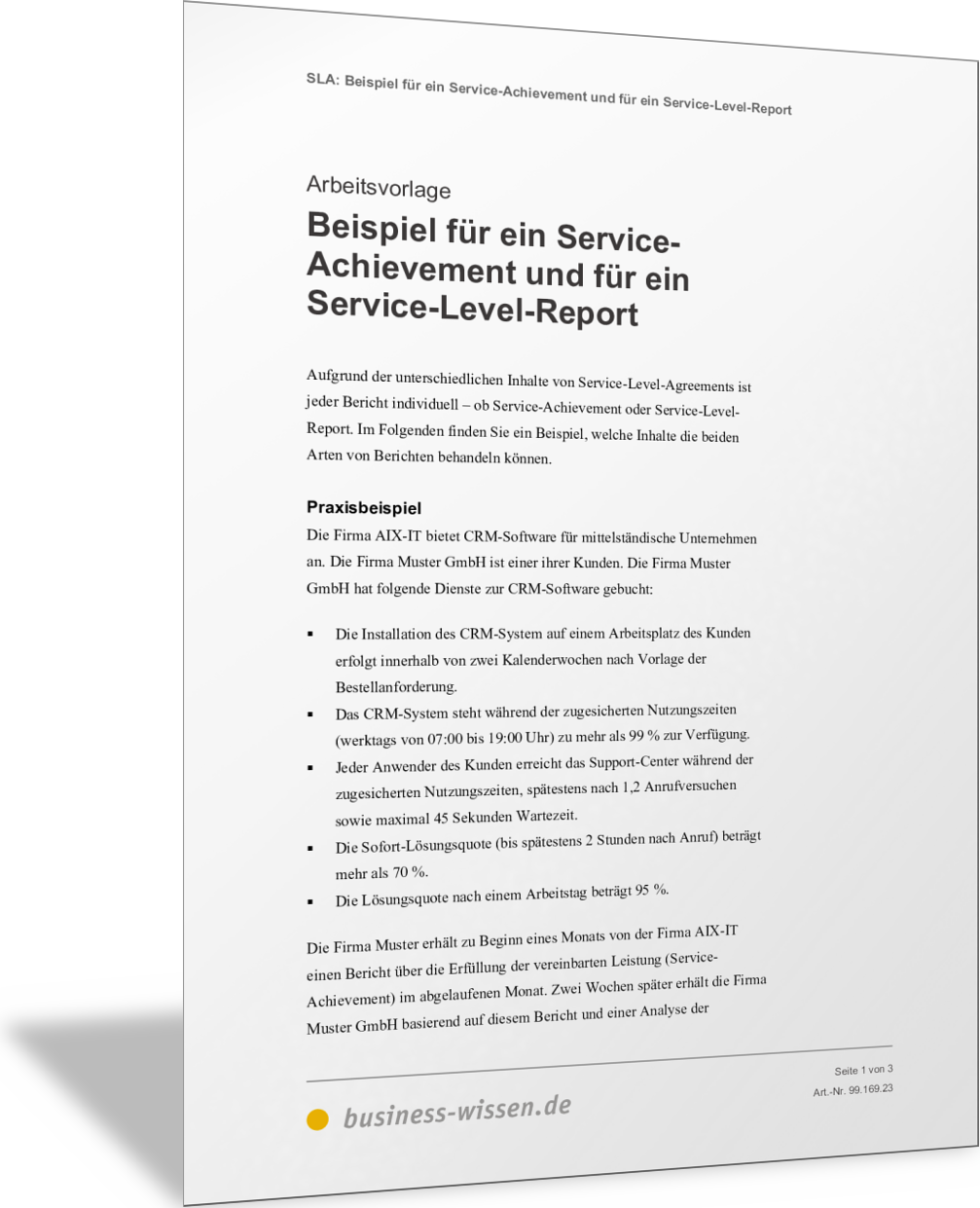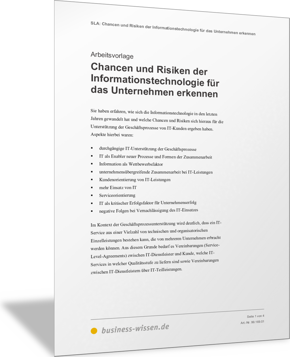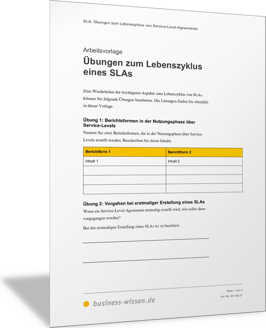 Beachten Sie bei der Erstellung von Service-Level-Agreements die folgenden Aspekte und Kriterien: Anforderungen und Erwartungen der Kunden, Inhalte eines SLAs, Formulierung eines SLAs, Qualität des SLA-Dokuments, Beschreibung der Leistungen und Pflichten im SLA, Verfügbarkeit von Services im SLA. Zu diesen Aspekten und Kriterien erläutert diese Vorlage, worauf zu achten ist. Nutzen Sie die Vorlage, um Ihre bestehenden Service-Level-Agreements zu überprüfen im Hinblick auf Vollständigkeit, Verständlichkeit, Eindeutigkeit etc. Erstellen Sie neue Service-Level-Agreements mit den genannten Kriterien.