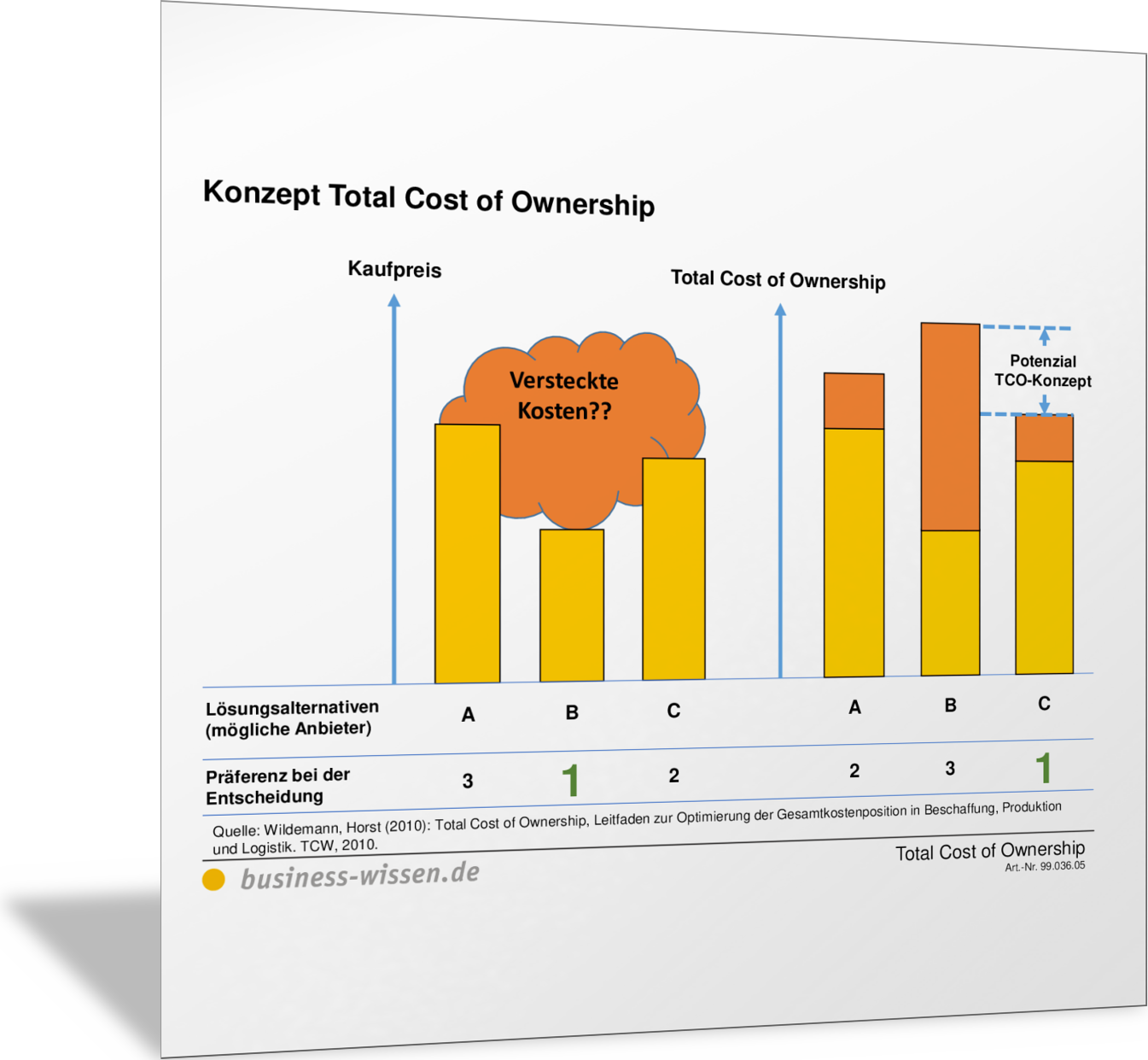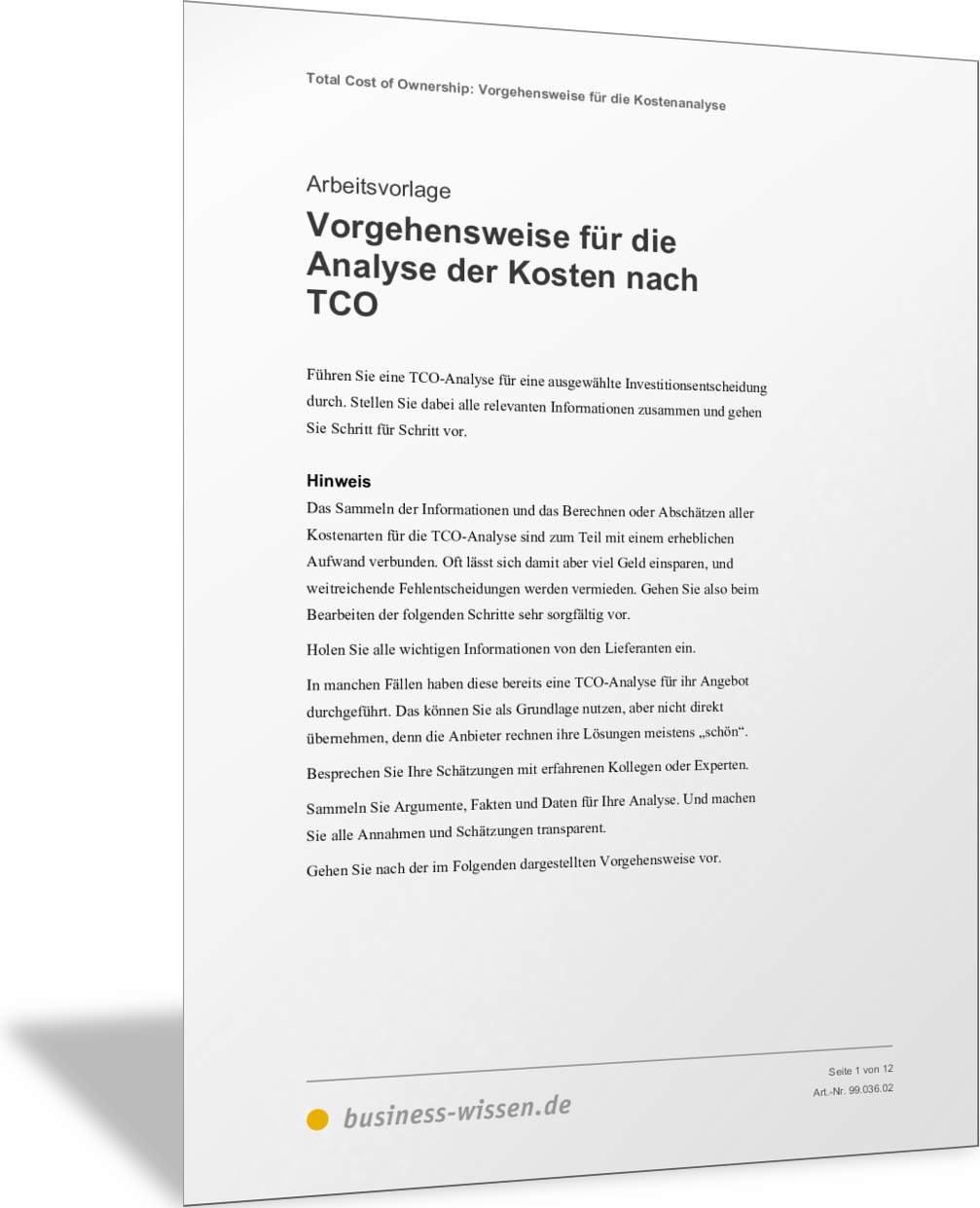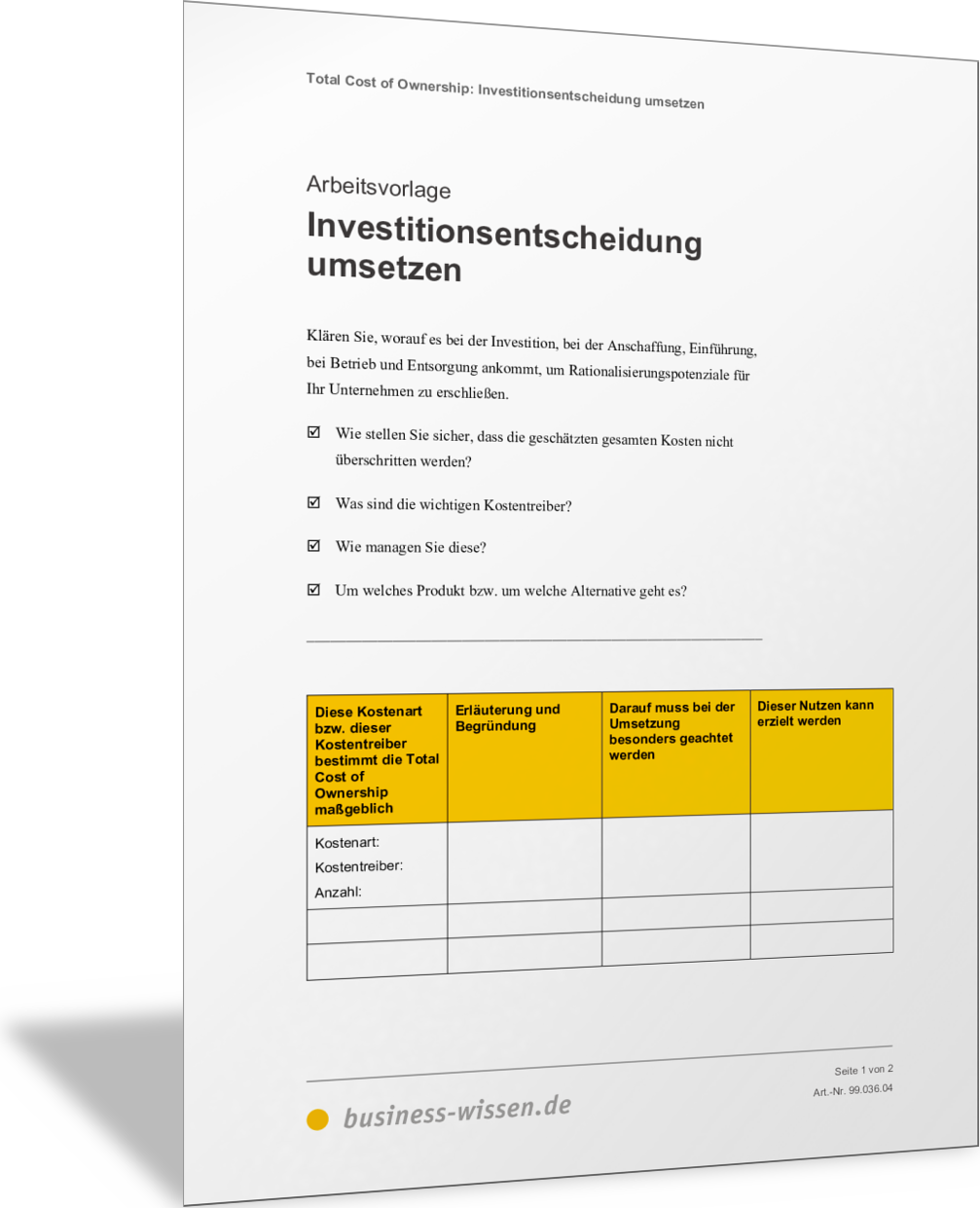 Mit dieser Vorlage stellen Sie zusammen, welche laufenden Kosten oder Betriebskosten durch eine Investition ausgelöst werden. Sie ermitteln, welche der Kosten Kostentreiber im Sinne des Total Cost of Ownership (TCO) sind. Und Sie legen fest, wie Sie die Kostentreiber im Griff behalten. Wenn Sie diese Kostentreiber im Blick haben, stellen Sie sicher, dass bei der Umsetzung Ihrer Investitionsentscheidung die Kosten nicht höher sind, als vorab nach dem TCO-Konzept berechnet.