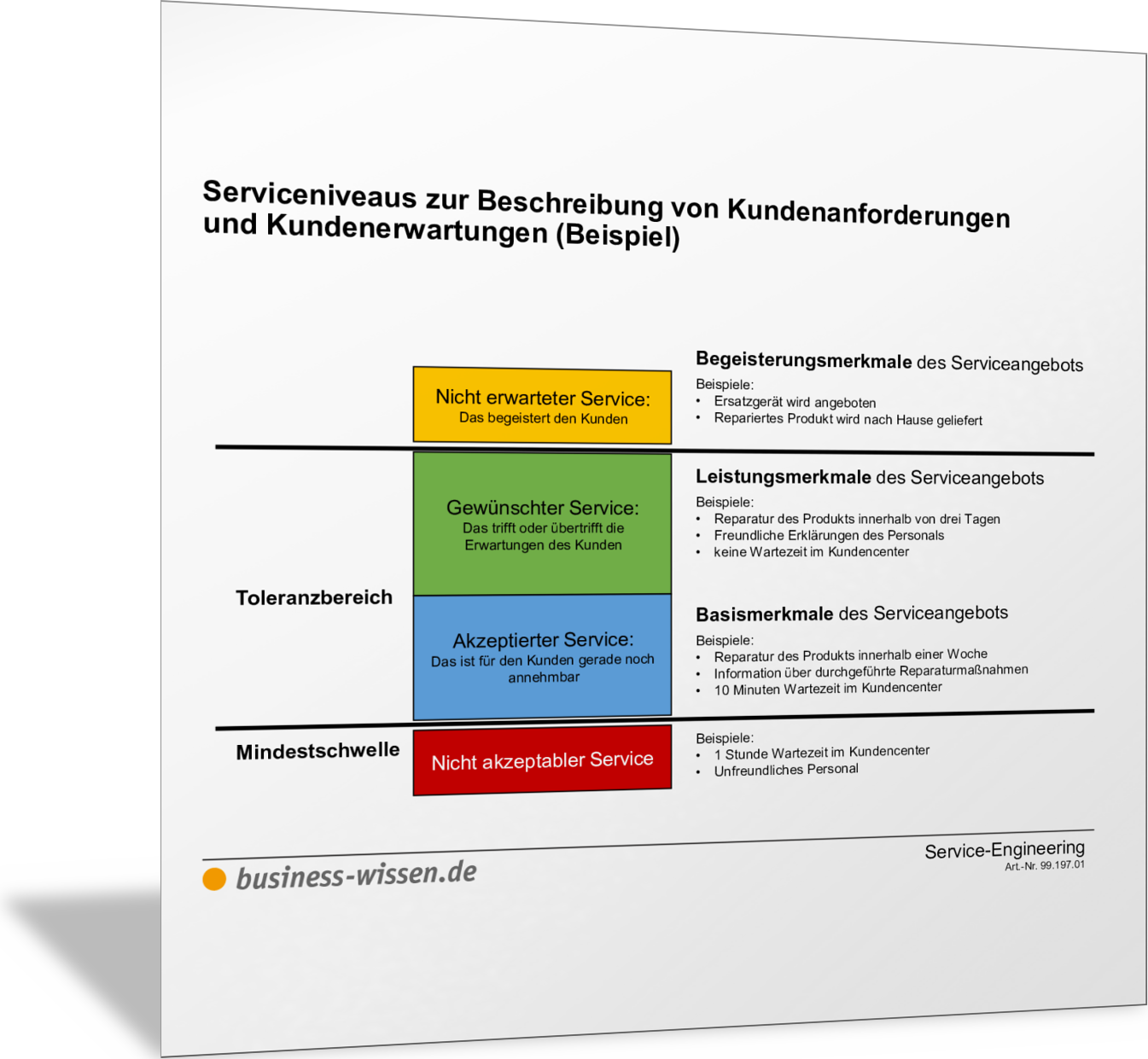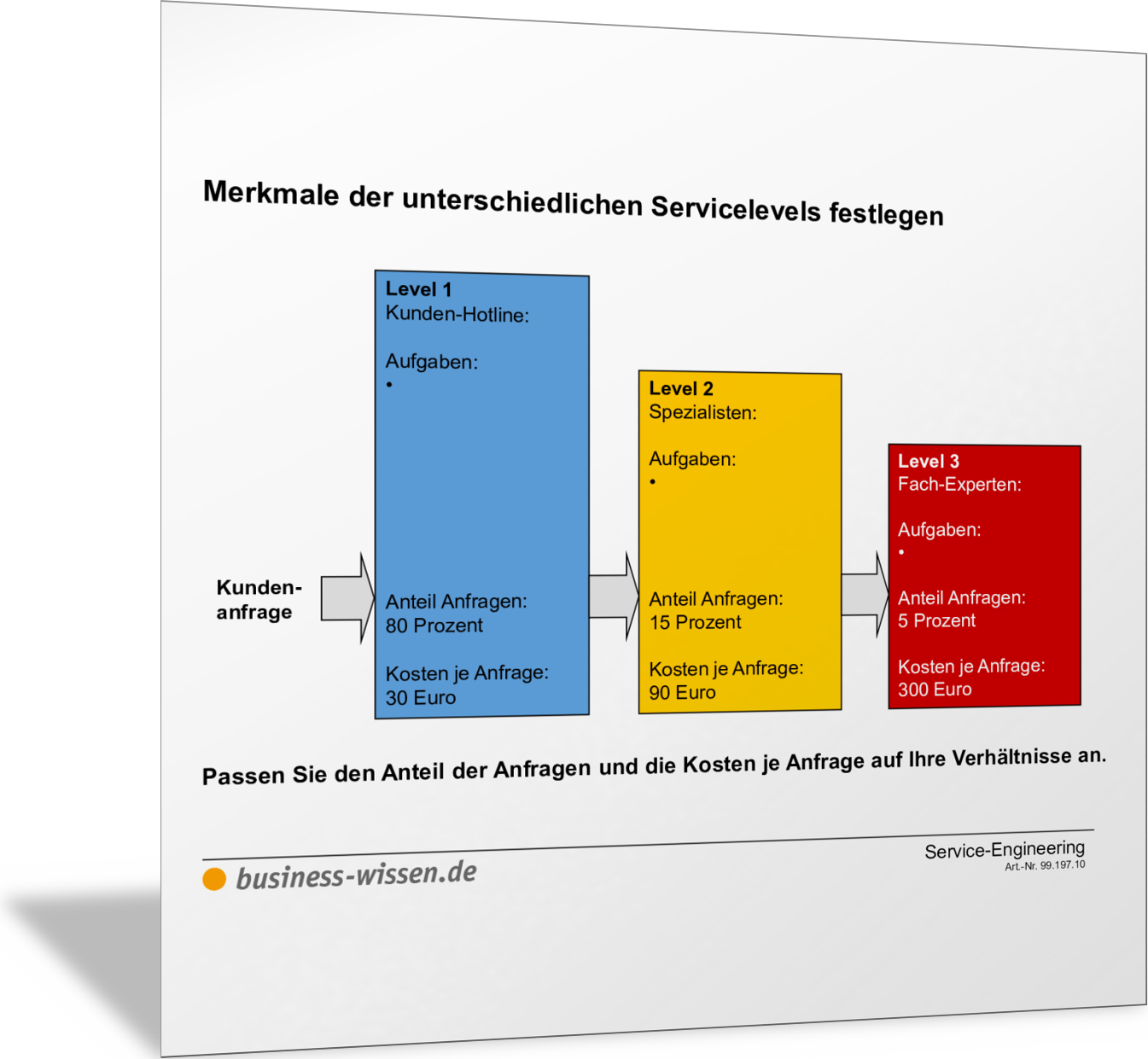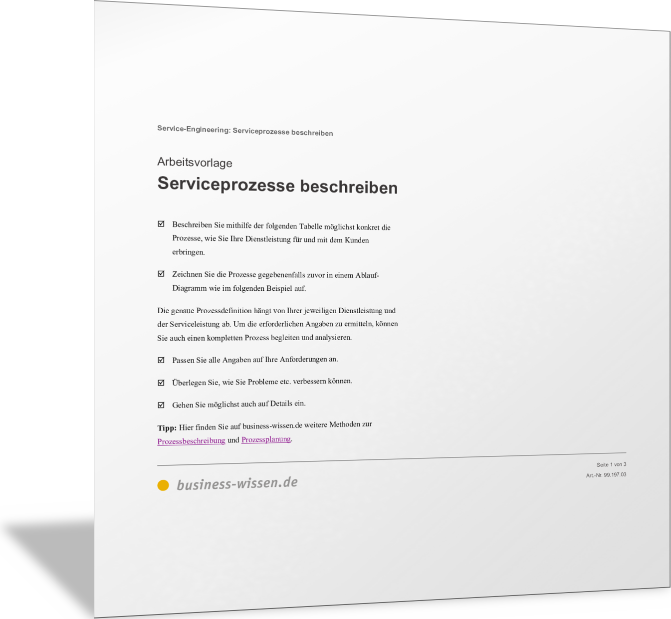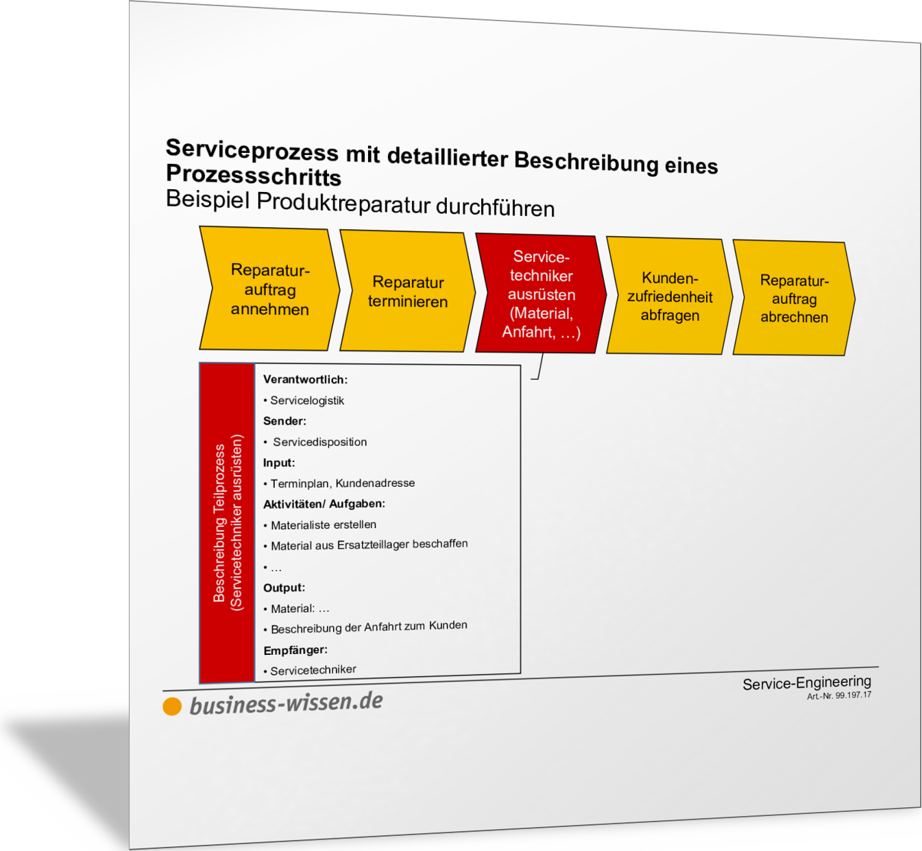 Die Abbildung zeigt, wie Sie Serviceprozesse insgesamt und einzelne Prozessschritte darstellen und beschreiben können. Sie können die Abläufe im Service so detailliert beschreiben, wie es für Ihre Zwecke hilfreich ist. Orientieren Sie sich am SIPOC-Modell, indem Sie festhalten: Sender (löst Prozessschritt aus), Input, Aktivitäten, Output, Empfänger (erhält das Serviceergebnis).