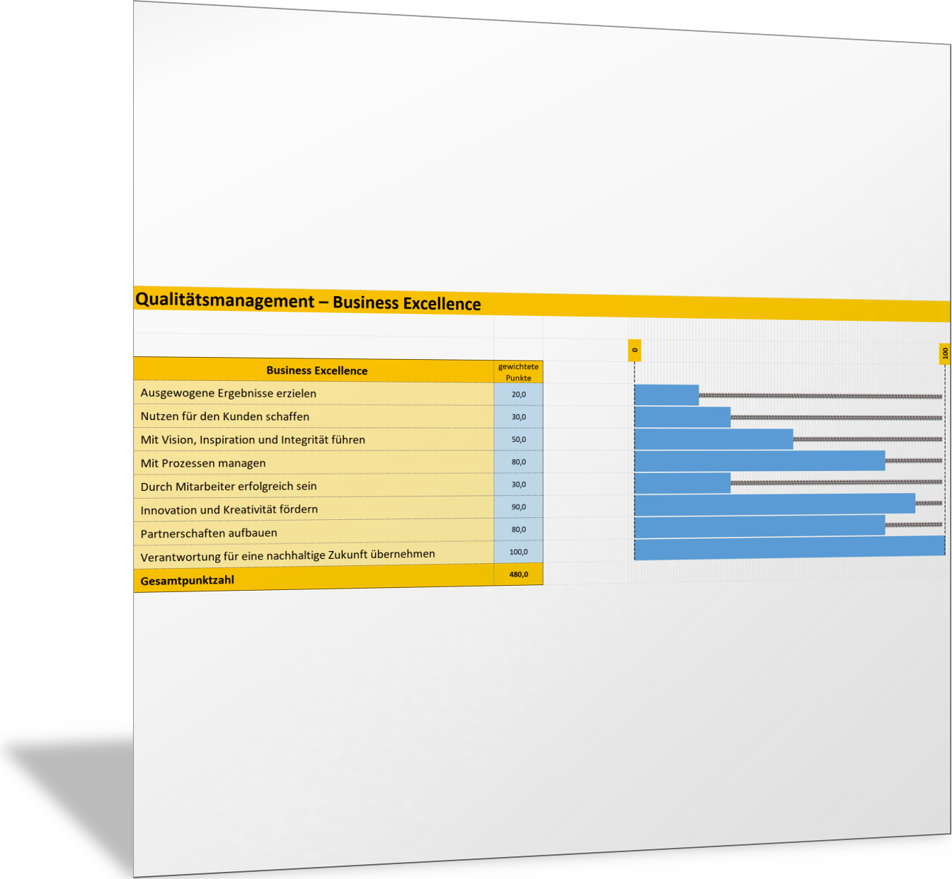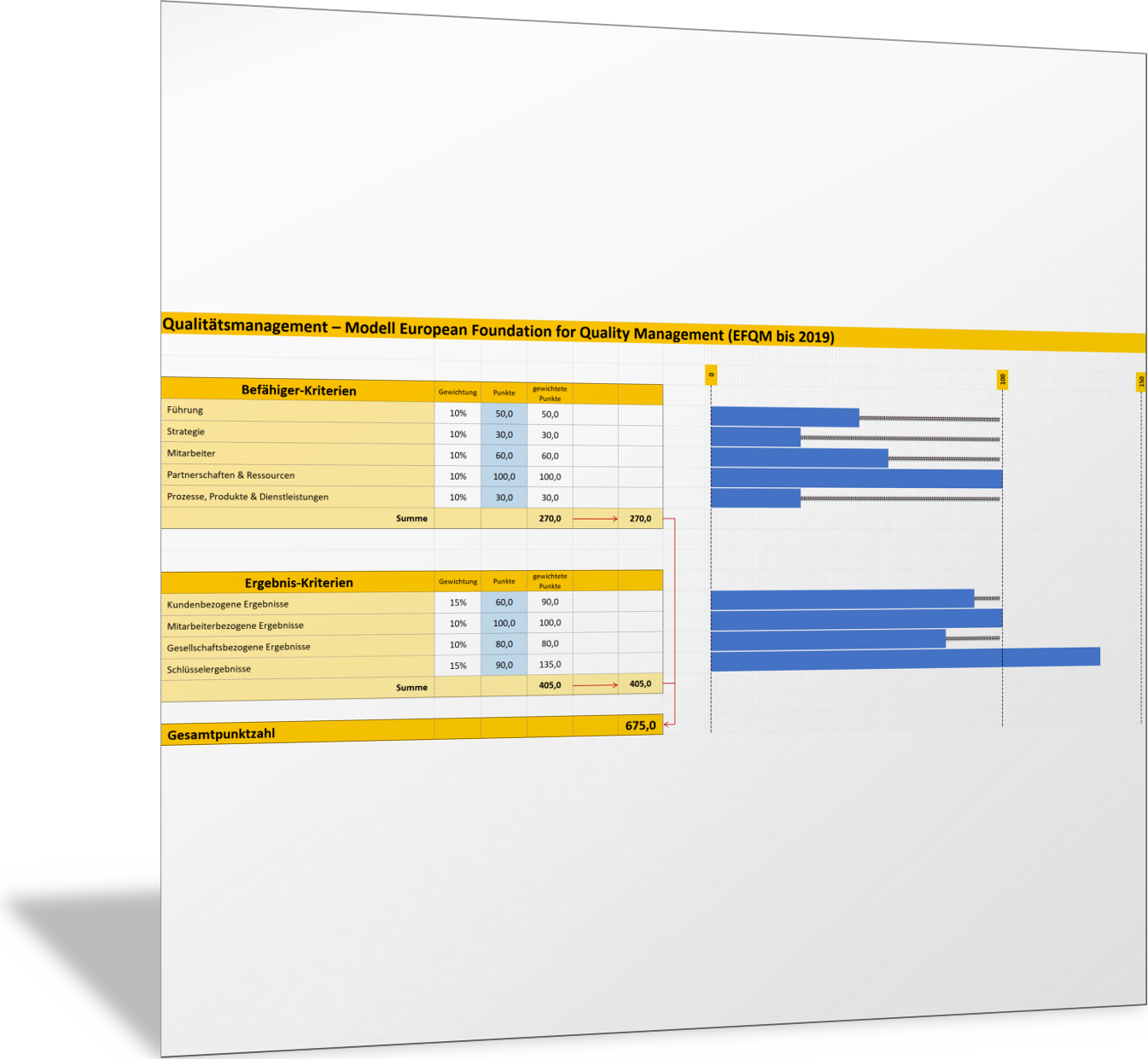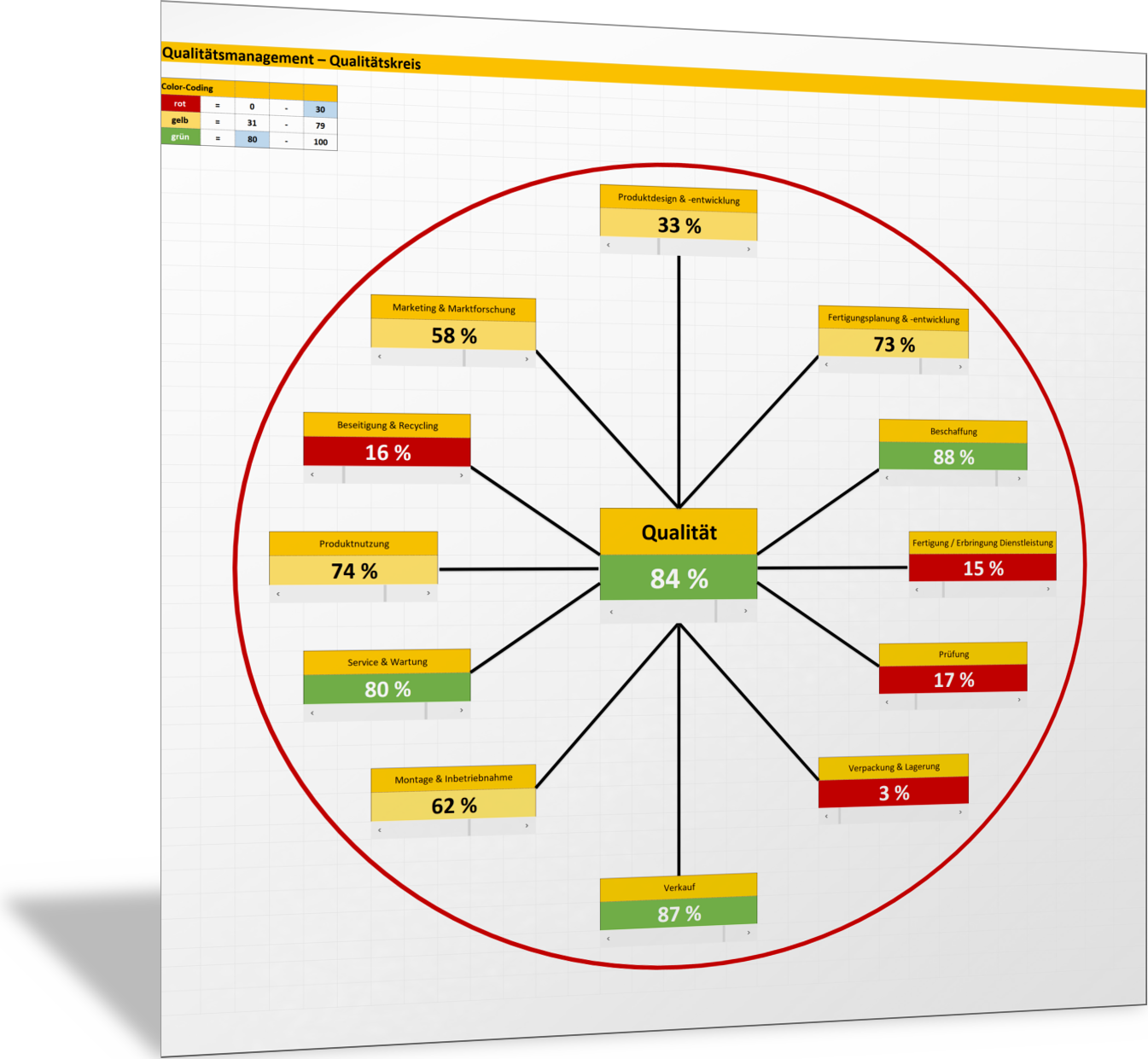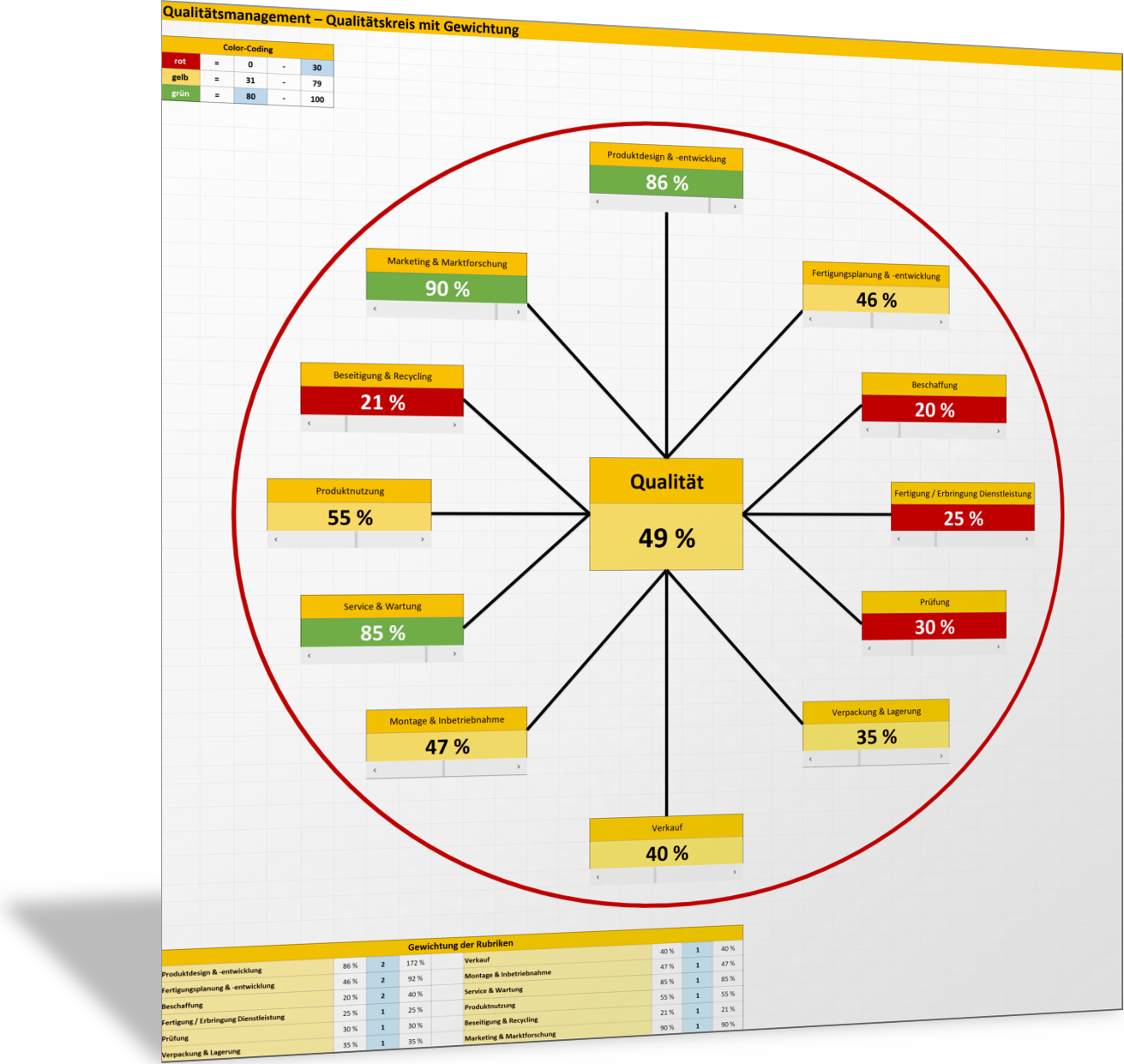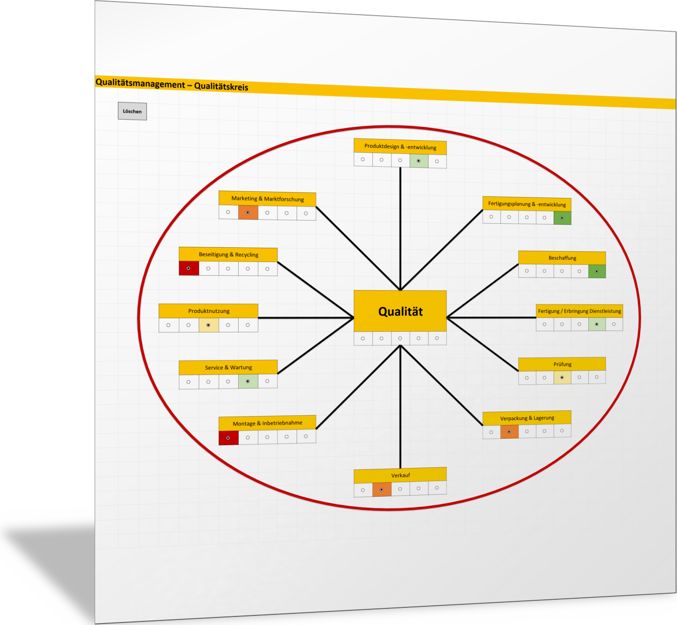 In jedem Funktionsbereich eines Unternehmens können die Qualität und das Qualitätsleitbild unterschiedlich stark verankert sein. Mit dieser Excel-Vorlage bewerten Sie diese Bedeutung in den Bereichen Führung, Forschung und Entwicklung, Einkauf, Produktion, Verkauf, Marketing, Service. Sie vergleichen Soll- und Ist-Zustand und bilden dies in einem Diagramm ab.