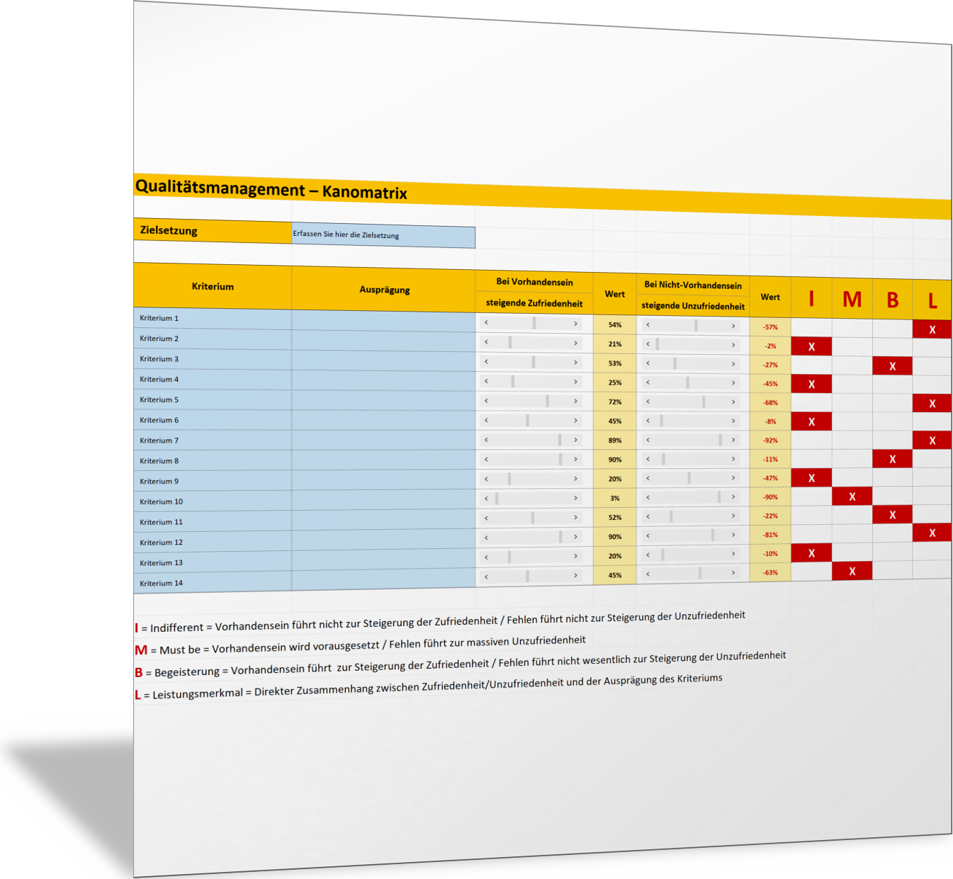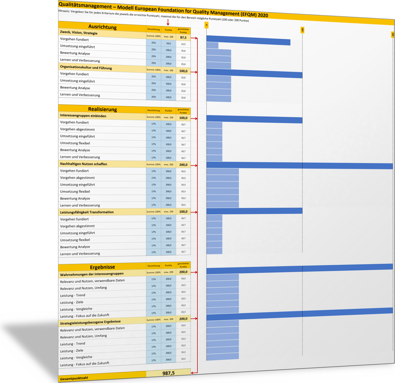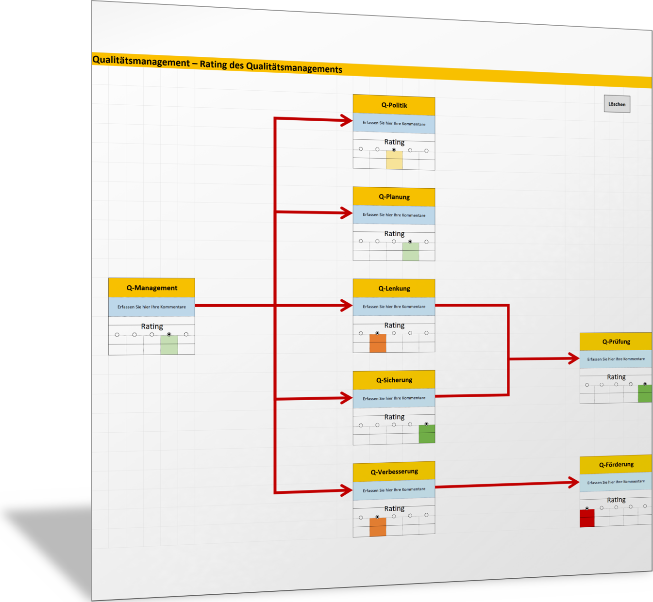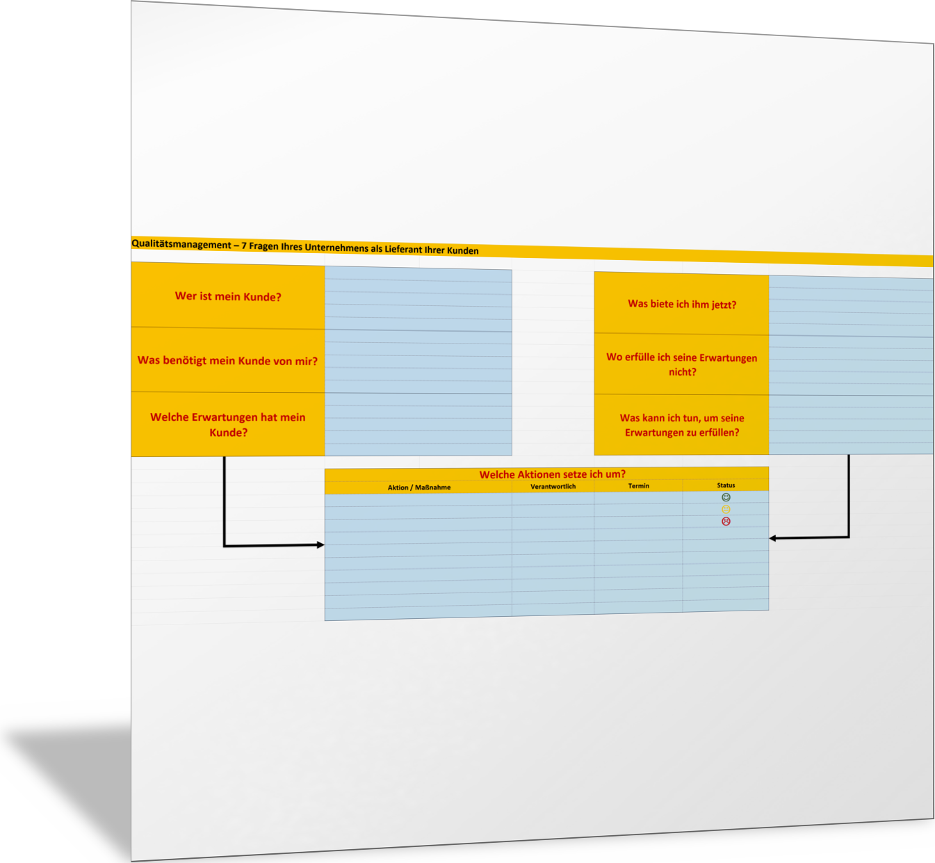 In jedem Funktionsbereich eines Unternehmens können die Qualität und das Qualitätsleitbild unterschiedlich stark verankert sein. Mit dieser Excel-Vorlage bewerten Sie diese Bedeutung in den Bereichen Führung, Forschung und Entwicklung, Einkauf, Produktion, Verkauf, Marketing, Service. Sie vergleichen Soll- und Ist-Zustand und bilden dies in einem Diagramm ab.