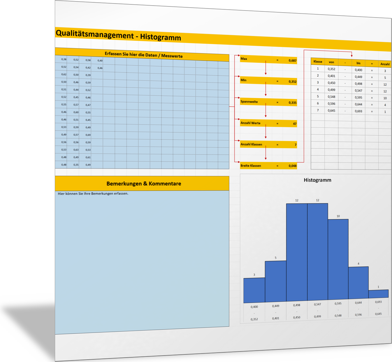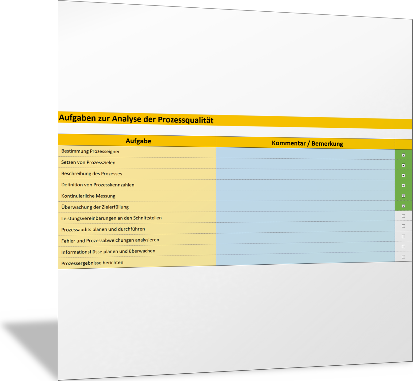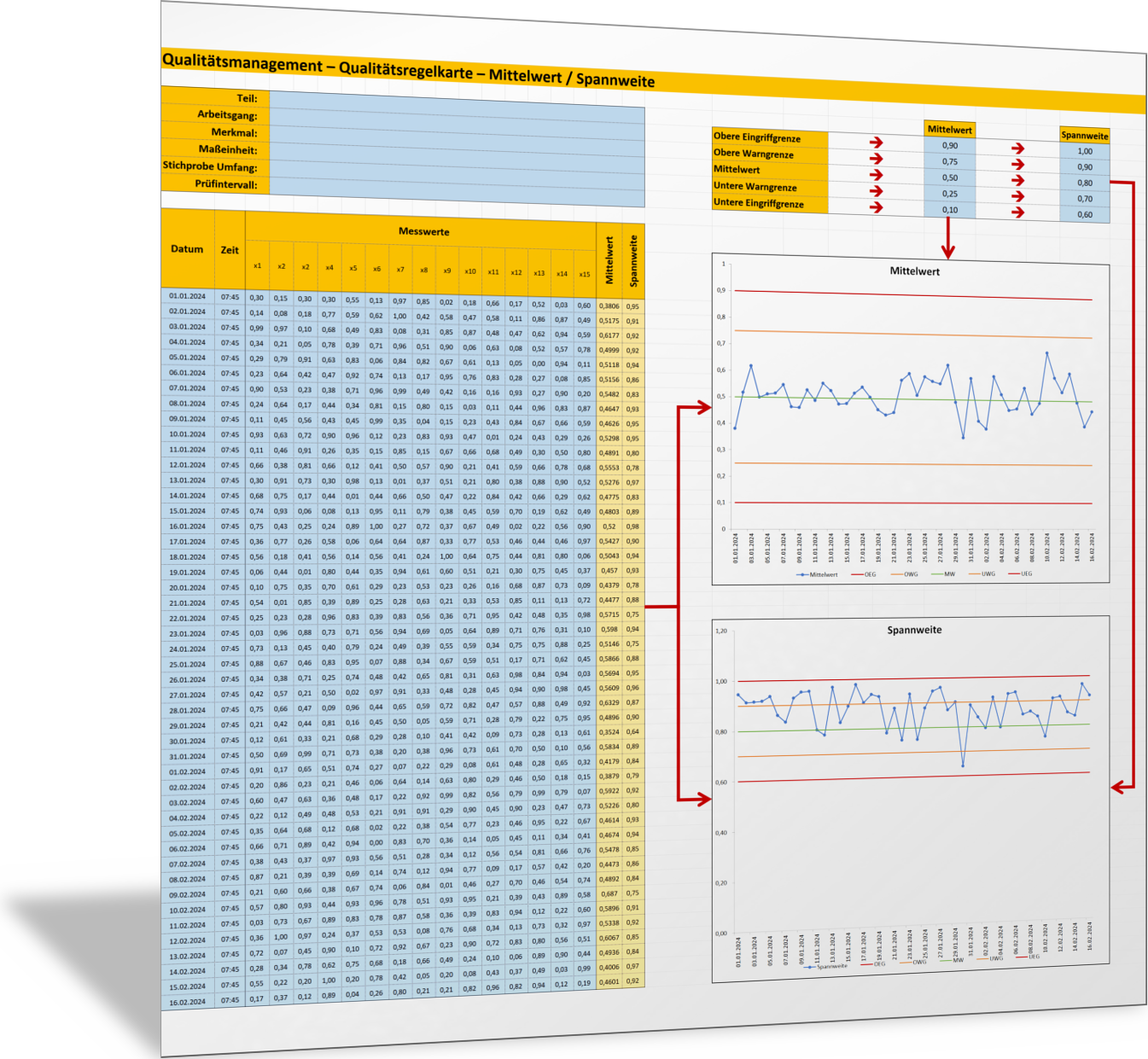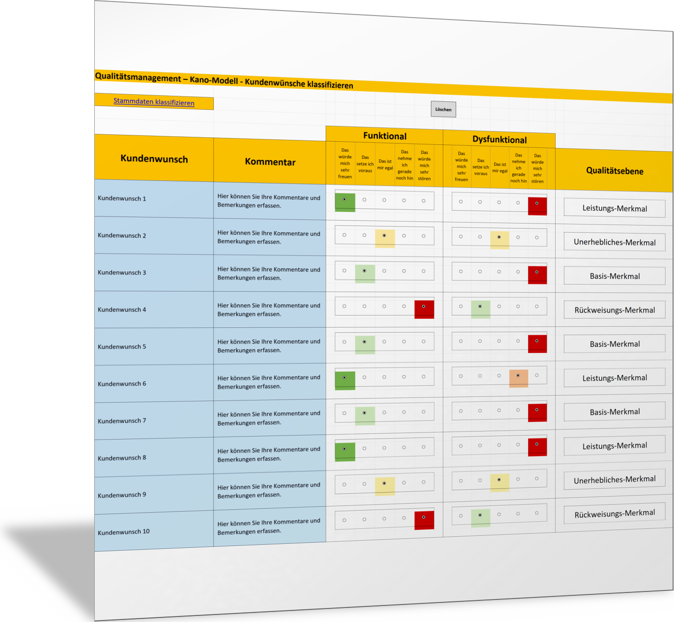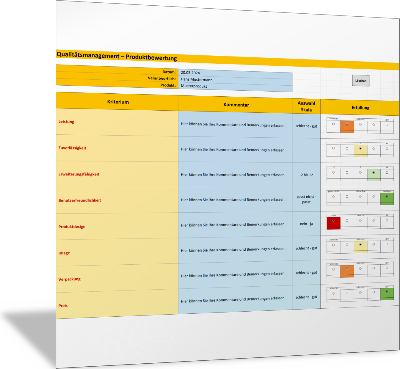 In jedem Funktionsbereich eines Unternehmens können die Qualität und das Qualitätsleitbild unterschiedlich stark verankert sein. Mit dieser Excel-Vorlage bewerten Sie diese Bedeutung in den Bereichen Führung, Forschung und Entwicklung, Einkauf, Produktion, Verkauf, Marketing, Service. Sie vergleichen Soll- und Ist-Zustand und bilden dies in einem Diagramm ab.